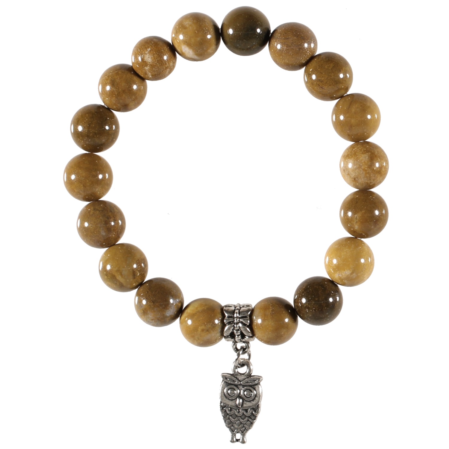 Bracelet élastique avec plume en métal argenté et boules en pierre bronzite.