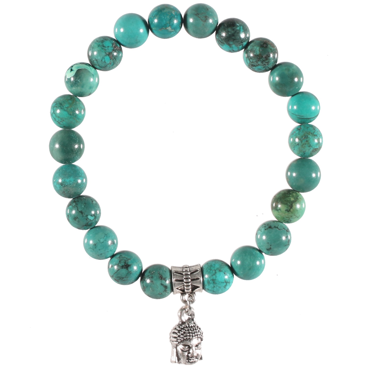 Bracelet élastique avec tête de Bouddha en métal argenté et boules en turquoise. Bouddha Boule Elastique Perle Turquoise  Adolescent Adulte Femme Fille Indémodable Personnage Religion