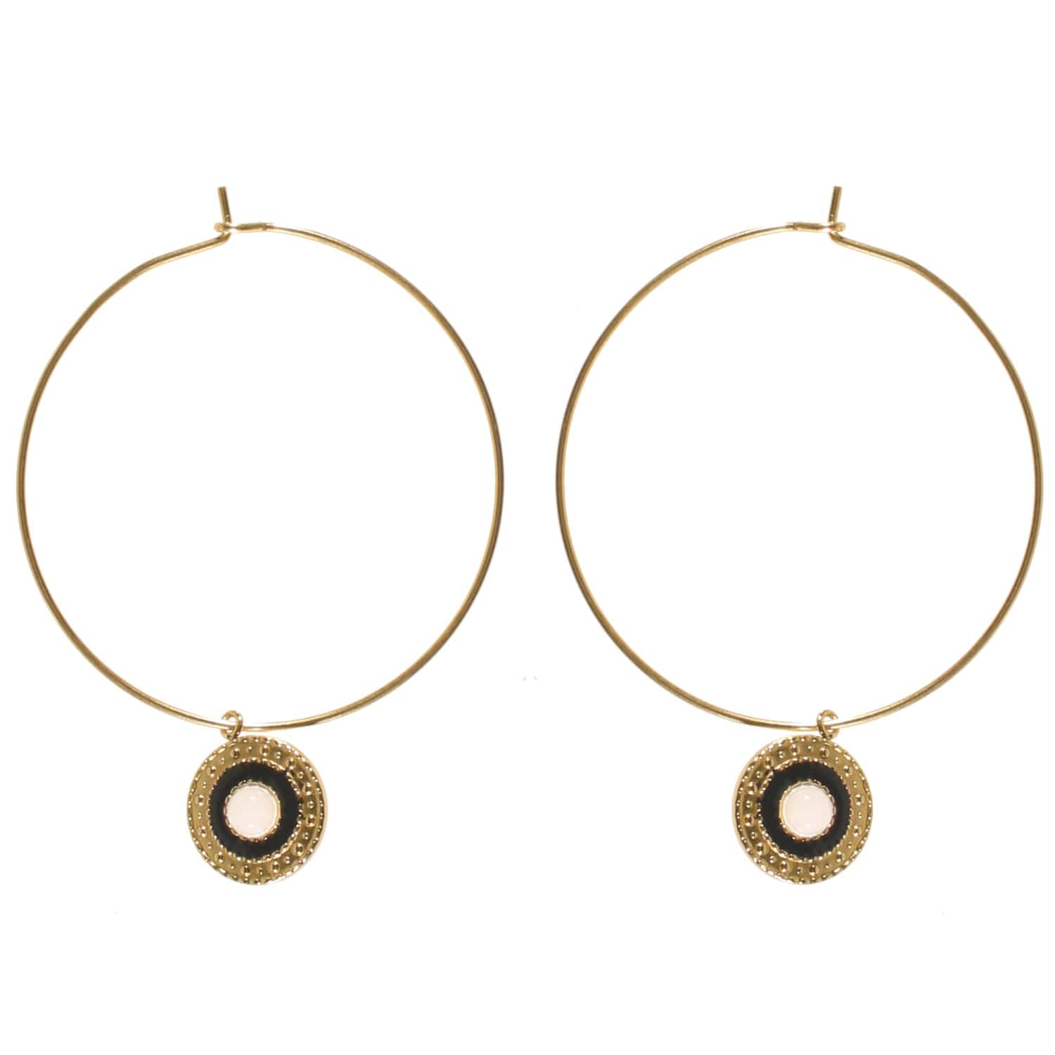 Description Boucles d'oreilles créoles pendantes en acier doré et pastille avec perle en émail. Largeur 12 mm Hauteur 52 mm Diamètre 40 mm Matière(s) Acier , Email . L'acier utilisé dans la bijouterie existe sous plusieurs qualités. Nous utilisons principalement la qualité 316L, qualité qui est utilisée en chirurgie. Cet acier est donc inoxydable et reste très résistant. Fermoir Autre Couleur(s) dominante(s) Blanc , Doré , Noir Public Adolescent , Adulte . Genre Femme , Fille . Saison Indémodable . Cliquez sur une matière, un thème, une couleur ou une collection pour voir tous les articles associés.
