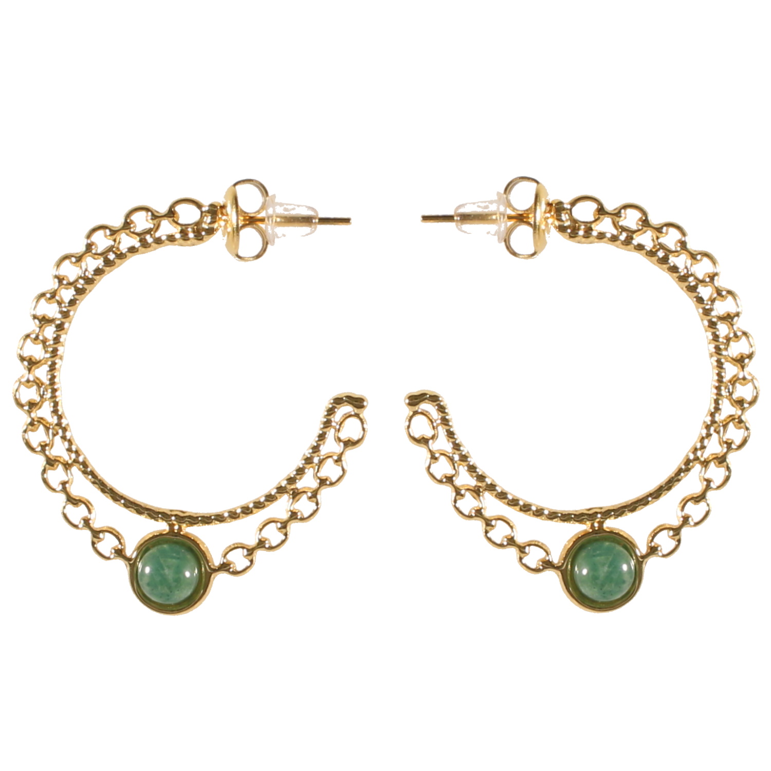 Boucles d'oreilles créoles ouvertes en forme de chaîne en acier doré et serties d'une véritable pierre de jade d'Afrique.