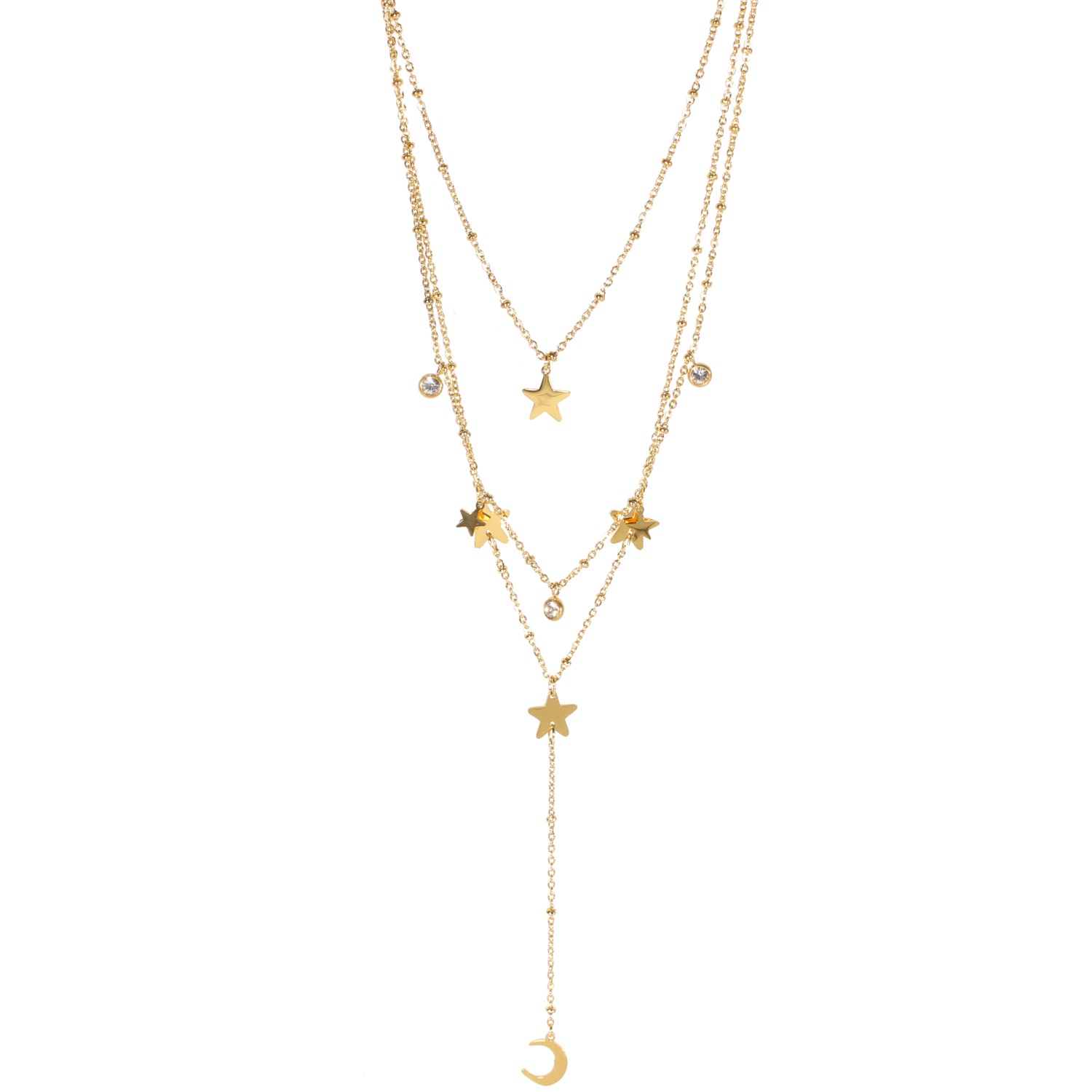 Description Collier triple rangs avec étoiles, croissant de lune en acier doré et cristaux sertis clos. Cliquez sur une matière, un thème, une couleur ou une collection pour voir tous les articles associés.