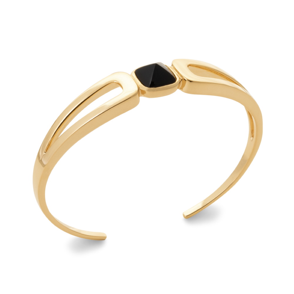 Bracelet jonc rigide ouvert en plaqué or jaune 18 carats surmontée d'une véritable pierre d'agate noire sertie clos de forme pyramidale.