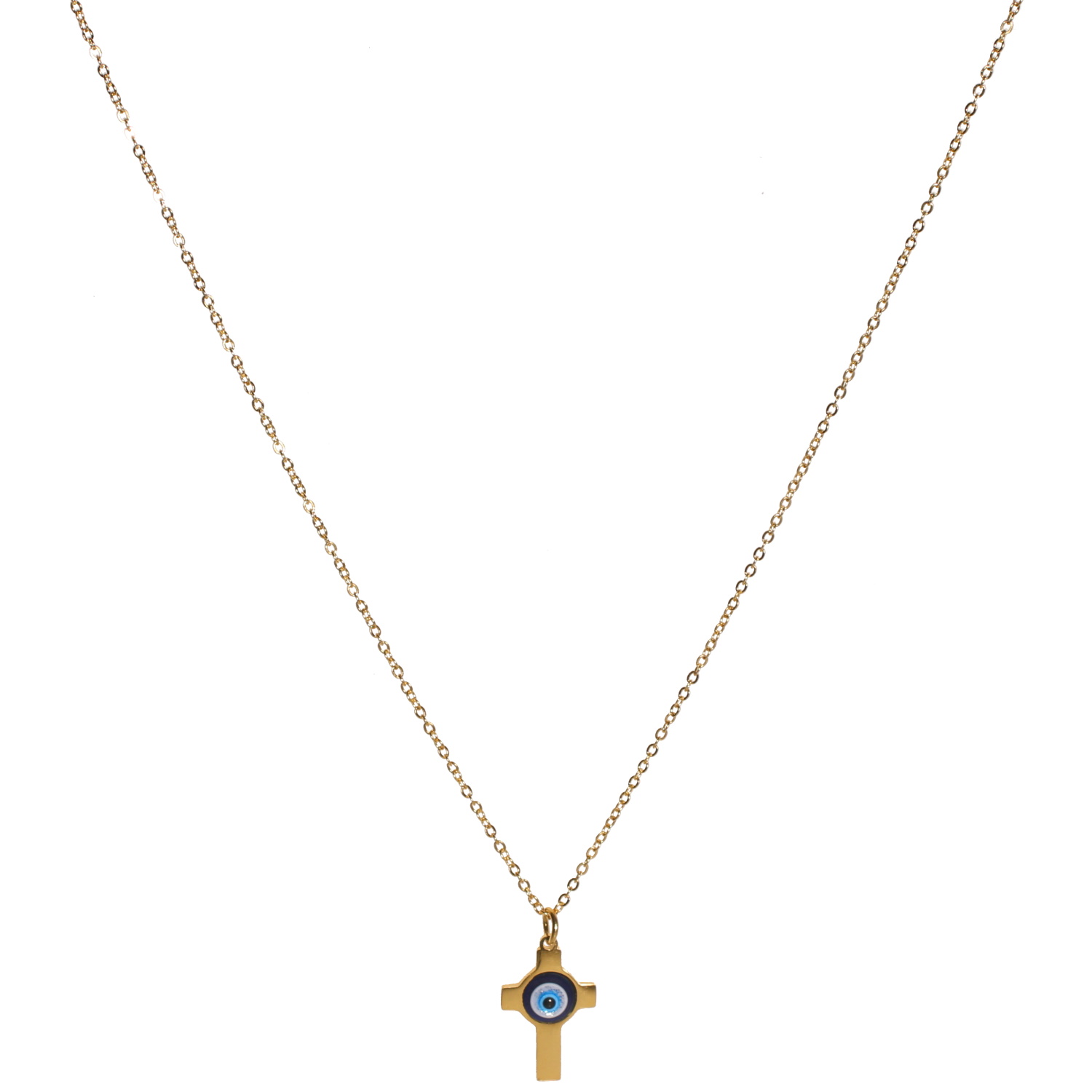 Collier composé d'une chaîne en acier doré et d'un pendentif en forme de croix surmontée d'un œil de Turquie.<br/>Fermoir mousqueton avec 5 cm de rallonge. Croix Oeil Oeil de Turquie Rond  Adolescent Adulte Femme Fille Indémodable Religion Symboles Collier composé d'une chaîne en acier doré et d'un pendentif en forme de croix surmontée d'un œil de Turquie.<br/>Fermoir mousqueton avec 5 cm de rallonge. Croix Oeil Oeil de Turquie Rond  Adolescent Adulte Femme Fille Indémodable Religion Symboles