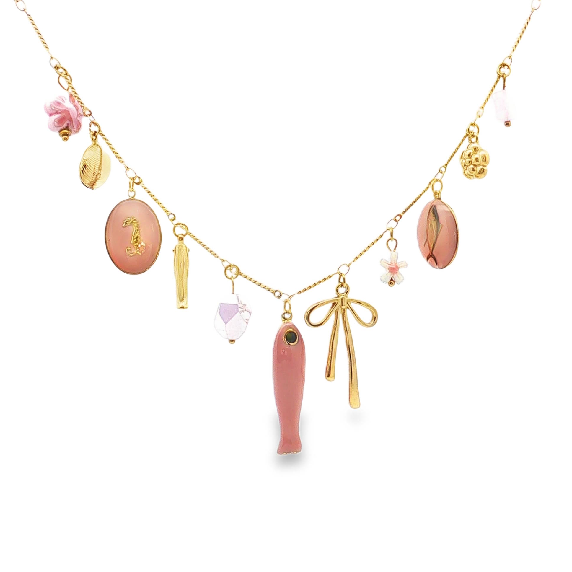 Ce collier en acier inoxydable, au fini doré éclatant, est une véritable célébration de l’esthétique balnéaire et poétique. Il se distingue par son accumulation de pendentifs variés qui capturent l'essence même de l'été et de la mer.