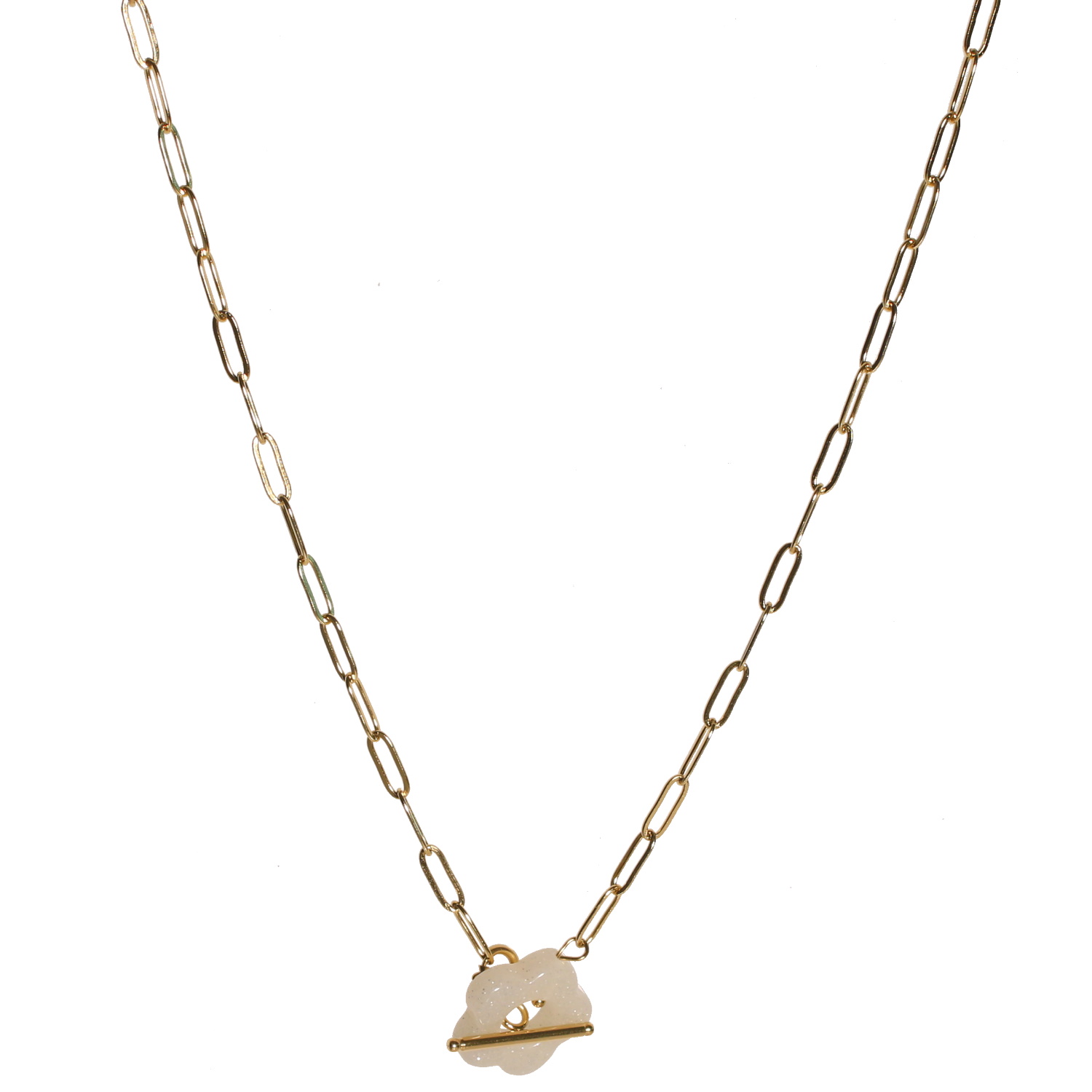 Description Collier composé d'une chaîne en acier doré et d'un fermoir cabillaud avec une fleur de couleur blanche. Cliquez sur une matière, un thème, une couleur ou une collection pour voir tous les articles associés.