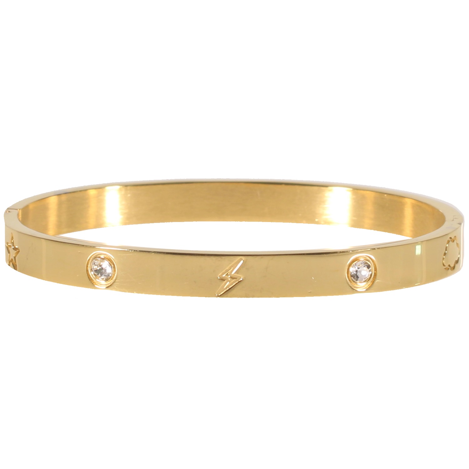 Description Bracelet jonc rigide avec gravures de nuages, éclairs et étoiles en acier doré et cristaux synthétiques. Largeur 6 mm Diamètre 58 mm [Guide des tailles] Matière(s) Acier , Verre . L'acier utilisé dans la bijouterie existe sous plusieurs qualités. Nous utilisons principalement la qualité 316L, qualité qui est utilisée en chirurgie. Cet acier est donc inoxydable et reste très résistant. Fermoir Charnière avec cran Couleur(s) dominante(s) Doré Public Adolescent , Adulte . Genre Femme , Fille . Saison Indémodable . Thème(s) Nature . Cliquez sur une matière, un thème, une couleur ou une collection pour voir tous les articles associés.