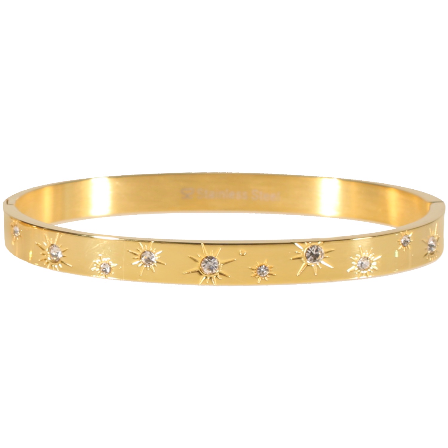Description Bracelet jonc rigide avec soleils gravés en acier doré et strass en verre. Largeur 6 mm Diamètre 60 mm [Guide des tailles] Matière(s) Acier , Verre . L'acier utilisé dans la bijouterie existe sous plusieurs qualités. Nous utilisons principalement la qualité 316L, qualité qui est utilisée en chirurgie. Cet acier est donc inoxydable et reste très résistant. Fermoir Charnière Couleur(s) dominante(s) Doré Public Adolescent , Adulte . Genre Femme , Fille . Saison Indémodable . Thème(s) Nature . Cliquez sur une matière, un thème, une couleur ou une collection pour voir tous les articles associés.