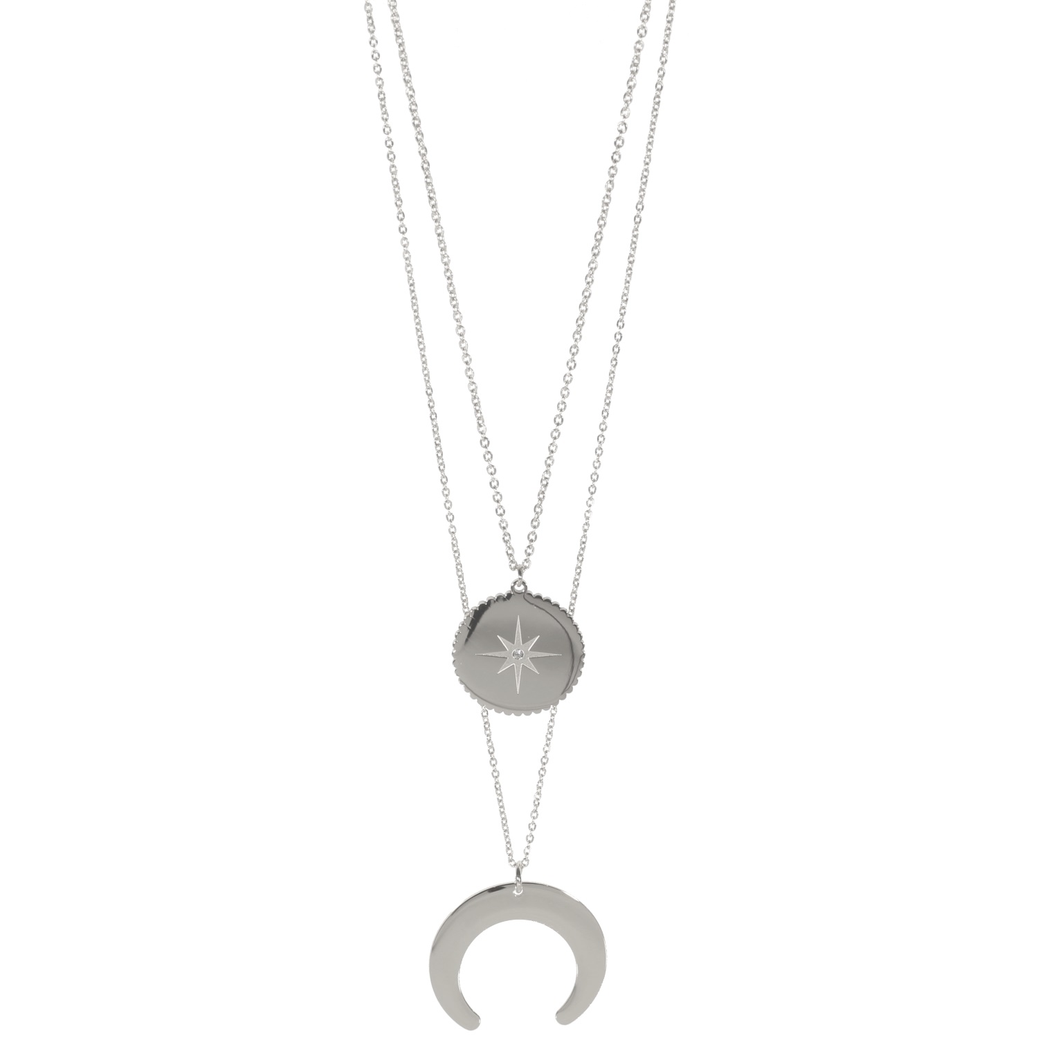 Description Collier deux rangs avec pendentifs en acier argenté et cristal en verre. Cliquez sur une matière, un thème, une couleur ou une collection pour voir tous les articles associés.