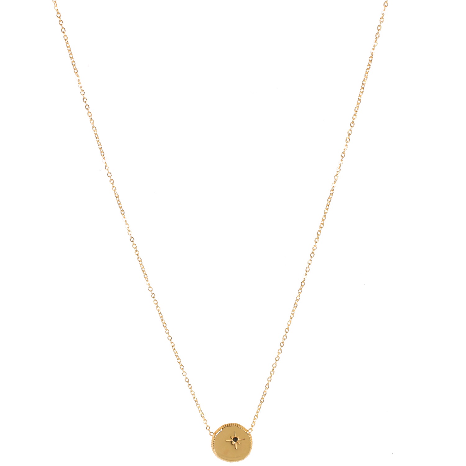 Description Collier composé d'une chaîne et d'un pendentif rond avec motif gravé d'une étoile en acier doré surmonté d'un cristal de couleur noire. Fermoir mousqueton avec une rallonge de 5 cm. Cliquez sur une matière, un thème, une couleur ou une collection pour voir tous les articles associés.