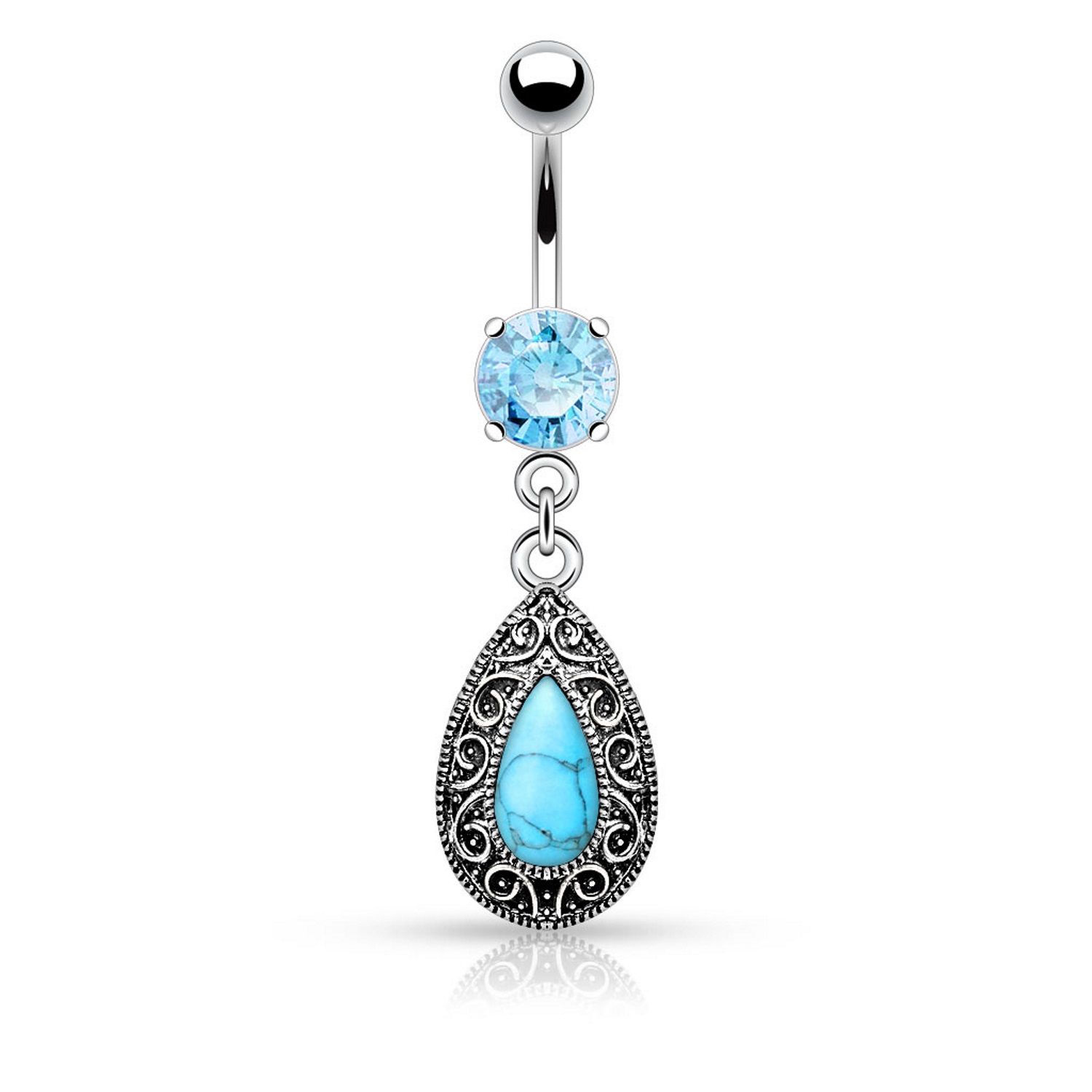 Piercing de nombril en acier chirurgical 316L et pierre d'imitation turquoise.