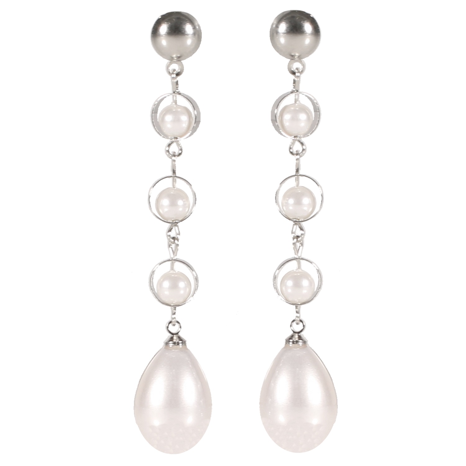 Description Boucles d'oreilles fantaisie pendantes en métal argenté et perles synthétiques. Cliquez sur une matière, un thème, une couleur ou une collection pour voir tous les articles associés.
