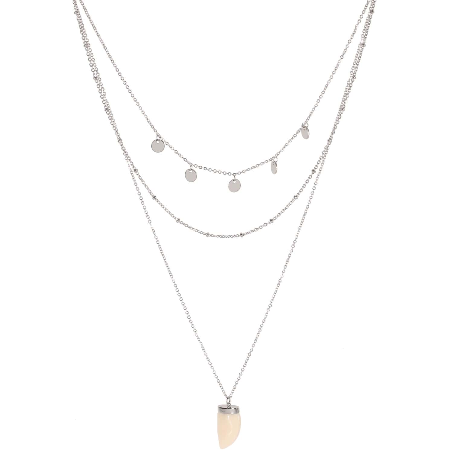 Collier triple rangs composé d'un collier de 37 cm de long avec pampilles en acier argenté, un collier de 43 cm de long en acier argenté ainsi qu'un collier de 55 cm de long en acier argenté avec pendentif imitation de dent en pierre de couleur blanche.