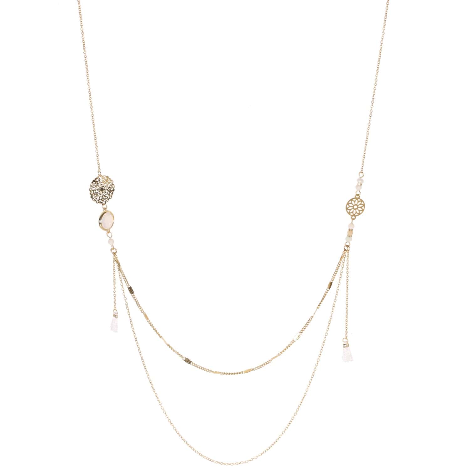 Collier sautoir composé d'un collier de 58 cm de long avec médaillons ajourés de motif en acier doré, pierre de couleur blanche sertie clos, pompon en textile et perles de couleur blanche, ainsi qu'un collier chaîne en acier doré qui allonge le collier de 8 cm.