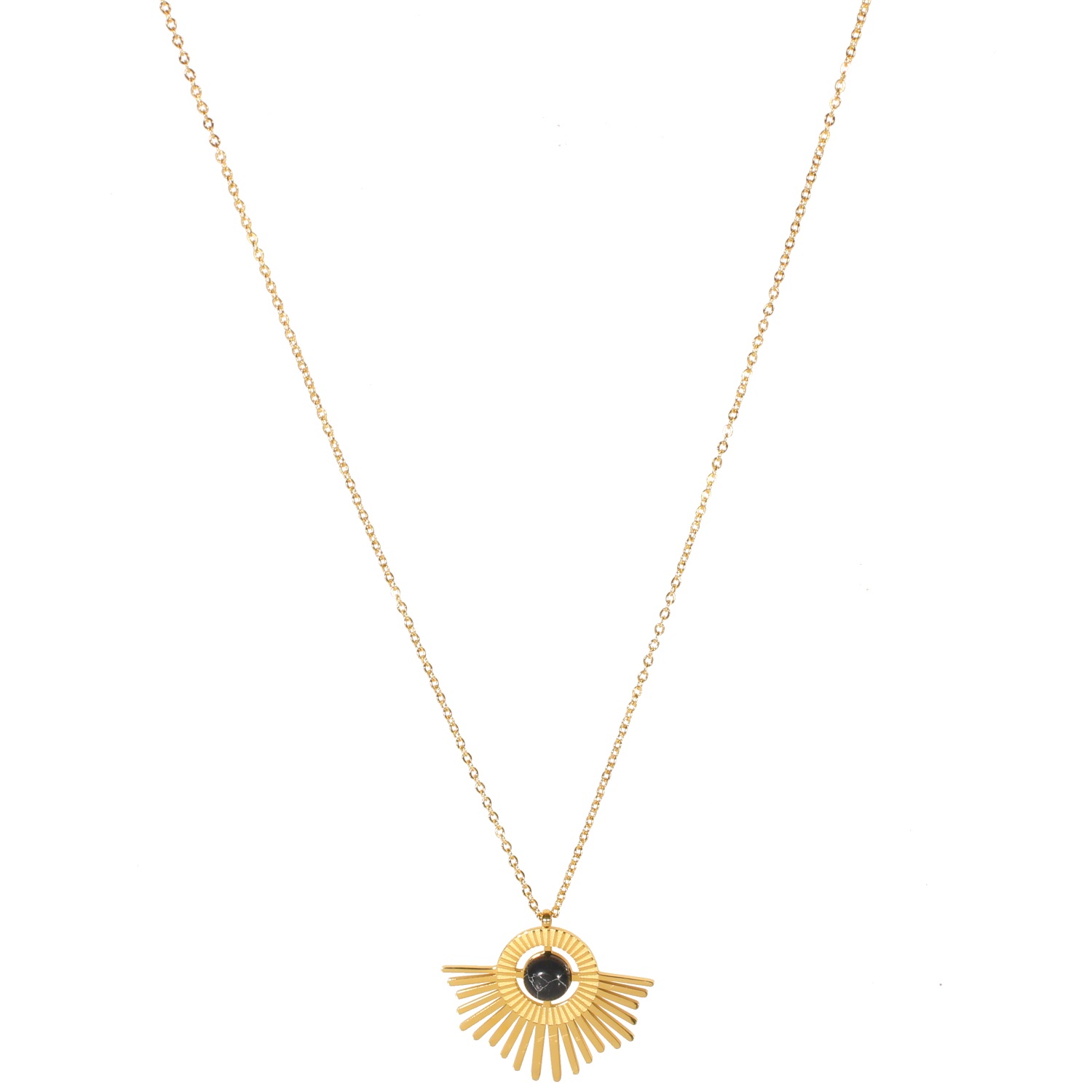 Description Collier composé d'une chaîne fine et d'un pendentif cercle avec rayons en acier doré surmonté de pierre de couleur noire. Fermoir mousqueton avec rallonge de 5 cm. Longueur 40+5 cm [Guide des tailles] Matière(s) Acier , Rocaille . L'acier utilisé dans la bijouterie existe sous plusieurs qualités. Nous utilisons principalement la qualité 316L, qualité qui est utilisée en chirurgie. Cet acier est donc inoxydable et reste très résistant. Fermoir Mousqueton À noter Pendentif de 26x21 mm Couleur(s) dominante(s) Doré , Noir Public Adolescent , Adulte . Genre Femme , Fille . Saison Indémodable . Thème(s) Nature . Cliquez sur une matière, un thème, une couleur ou une collection pour voir tous les articles associés.