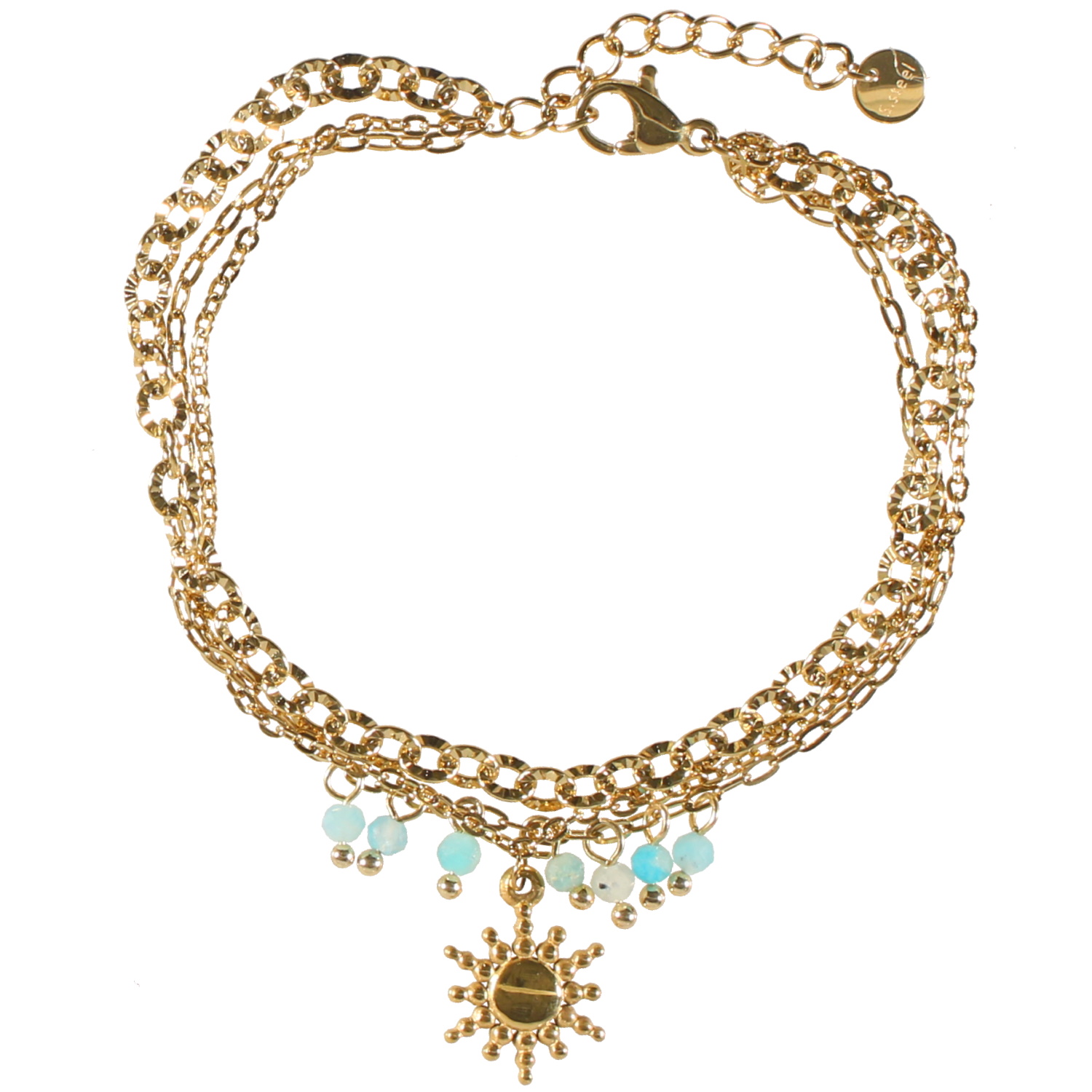 Description Bracelet triple rangs composé d'une chaîne en acier doré, une chaîne en acier doré et perles pendantes de couleur verte, ainsi qu'une chaîne avec pendentif soleil en acier doré. Fermoir mousqueton avec 3 cm de rallonge. Longueur 16+3 cm [Guide des tailles] Matière(s) Acier , Rocaille . L'acier utilisé dans la bijouterie existe sous plusieurs qualités. Nous utilisons principalement la qualité 316L, qualité qui est utilisée en chirurgie. Cet acier est donc inoxydable et reste très résistant. Fermoir Mousqueton À noter Soleil 11x13 mm Couleur(s) dominante(s) Doré , Vert Public Adolescent , Adulte . Genre Femme , Fille . Saison Indémodable . Thème(s) Nature . Cliquez sur une matière, un thème, une couleur ou une collection pour voir tous les articles associés.
