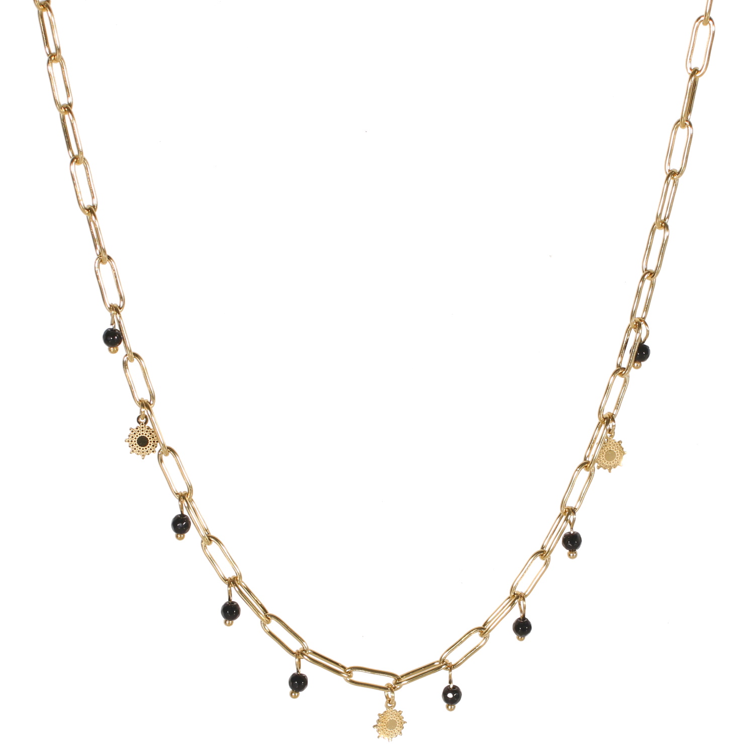 Collier composé d'une chaîne avec pampilles au motif de soleil en acier doré et pampilles en perles de véritable pierre d'agate noire.