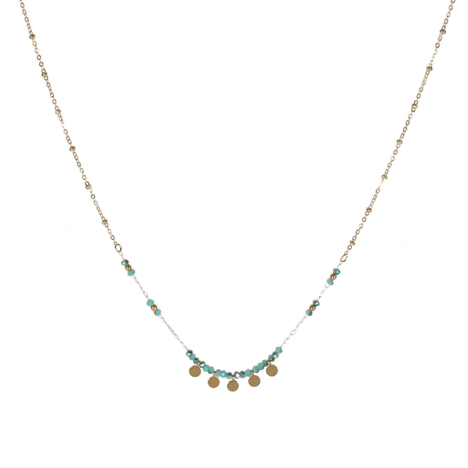 Description Collier composé d'une chaîne avec pampilles rondes en acier doré et de perles de couleur bleue turquoise. Fermoir mousqueton avec 5 cm de rallonge. Longueur 39+5 cm [Guide des tailles] Largeur 6 mm Matière(s) Acier , Rocaille . L'acier utilisé dans la bijouterie existe sous plusieurs qualités. Nous utilisons principalement la qualité 316L, qualité qui est utilisée en chirurgie. Cet acier est donc inoxydable et reste très résistant. Fermoir Mousqueton Couleur(s) dominante(s) Bleu , Doré Public Adolescent , Adulte . Genre Femme , Fille . Saison Indémodable . Cliquez sur une matière, un thème, une couleur ou une collection pour voir tous les articles associés.
