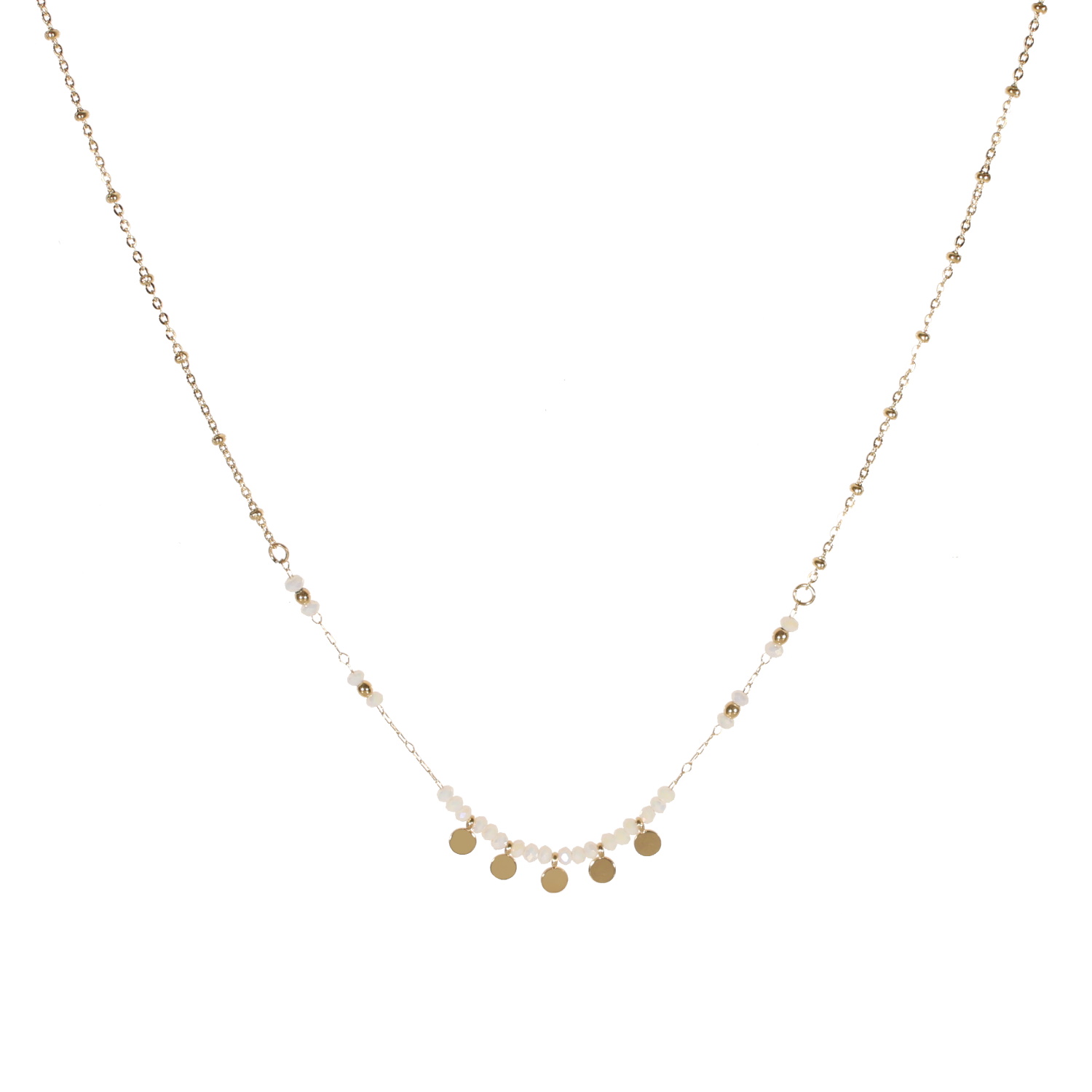 Description Collier composé d'une chaîne avec pampilles rondes en acier doré et de perles de couleur blanche. Fermoir mousqueton avec 5 cm de rallonge. Longueur 39+5 cm [Guide des tailles] Largeur 6 mm Matière(s) Acier , Rocaille . L'acier utilisé dans la bijouterie existe sous plusieurs qualités. Nous utilisons principalement la qualité 316L, qualité qui est utilisée en chirurgie. Cet acier est donc inoxydable et reste très résistant. Fermoir Mousqueton Couleur(s) dominante(s) Blanc , Doré Public Adolescent , Adulte . Genre Femme , Fille . Saison Indémodable . Cliquez sur une matière, un thème, une couleur ou une collection pour voir tous les articles associés.