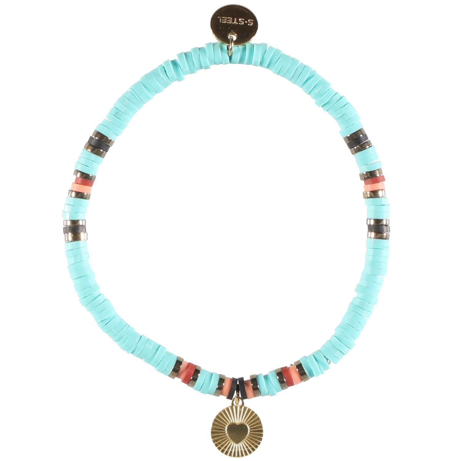 Bracelet élastique composé de perles cylindriques heishi en résine synthétique et caoutchouc de couleur et pendant rond au motif de cœur en acier doré.