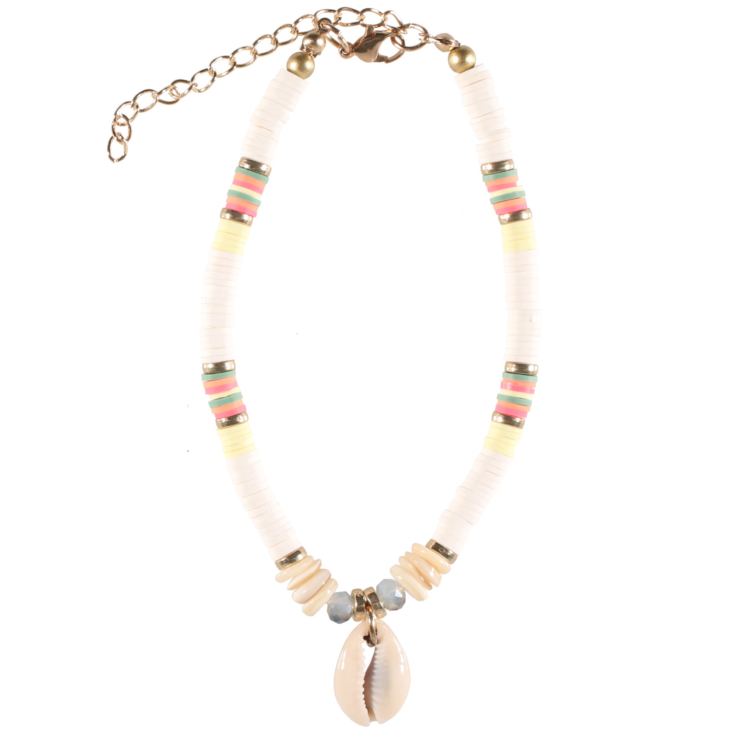 Bracelet chaîne de cheville composé de perles cylindriques heishi en résine synthétique et caoutchouc de couleur acidulée, de perles de nacre, perles de couleur et un véritable coquillage cauri.<br/>Fermoir mousqueton en métal doré avec 6 cm de rallonge. Cheville Coquillage Perle  Adolescent Adulte Eté Femme Fille Nature Bracelet chaîne de cheville composé de perles cylindriques heishi en résine synthétique et caoutchouc de couleur acidulée, de perles de nacre, perles de couleur et un véritable coquillage cauri.<br/>Fermoir mousqueton en métal doré avec 6 cm de rallonge. Cheville Coquillage Perle  Adolescent Adulte Eté Femme Fille Nature