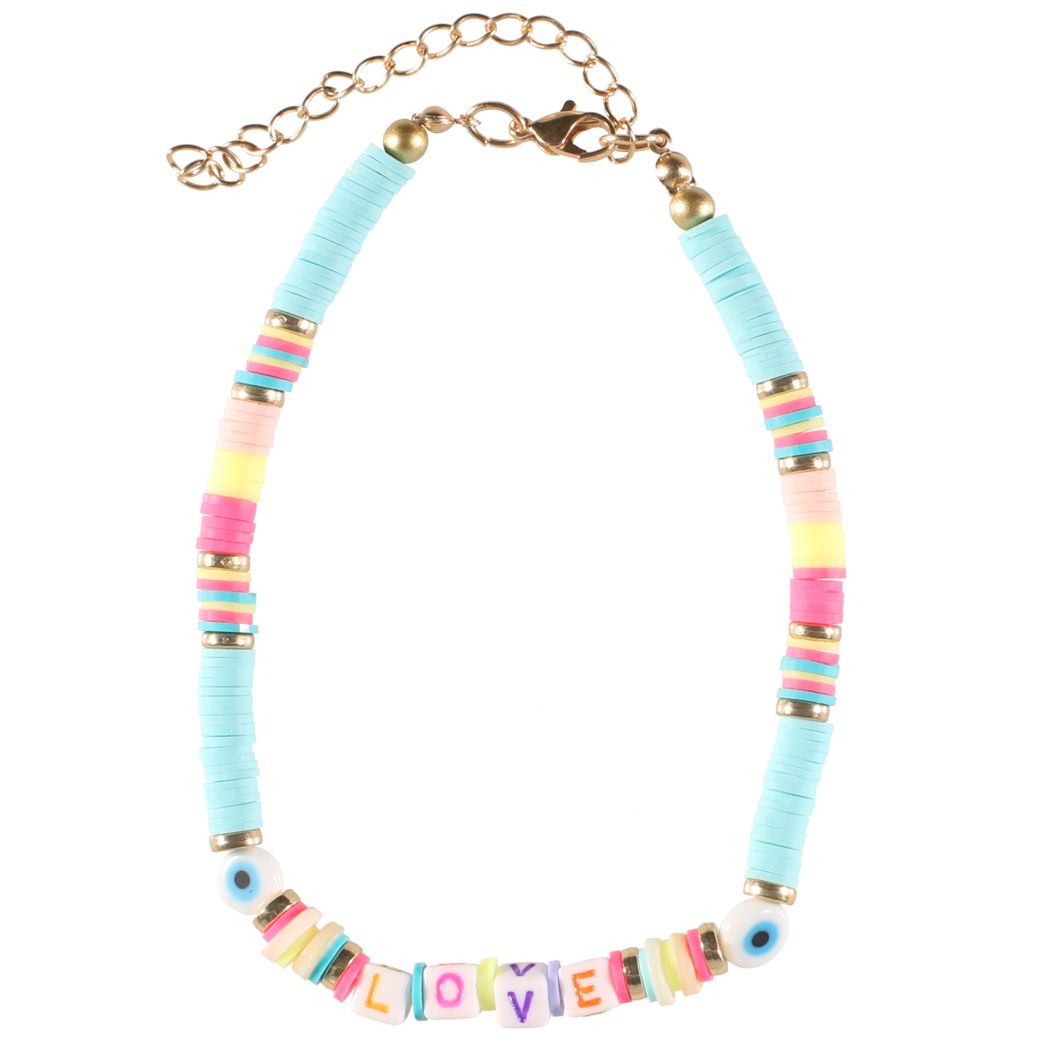 Bracelet chaîne de cheville composé de perles cylindriques heishi en résine synthétique et caoutchouc de couleur acidulée, perles plates rondes au motif d'œil de Turquie et 4 cubes avec lettres pour constituer le mot LOVE.