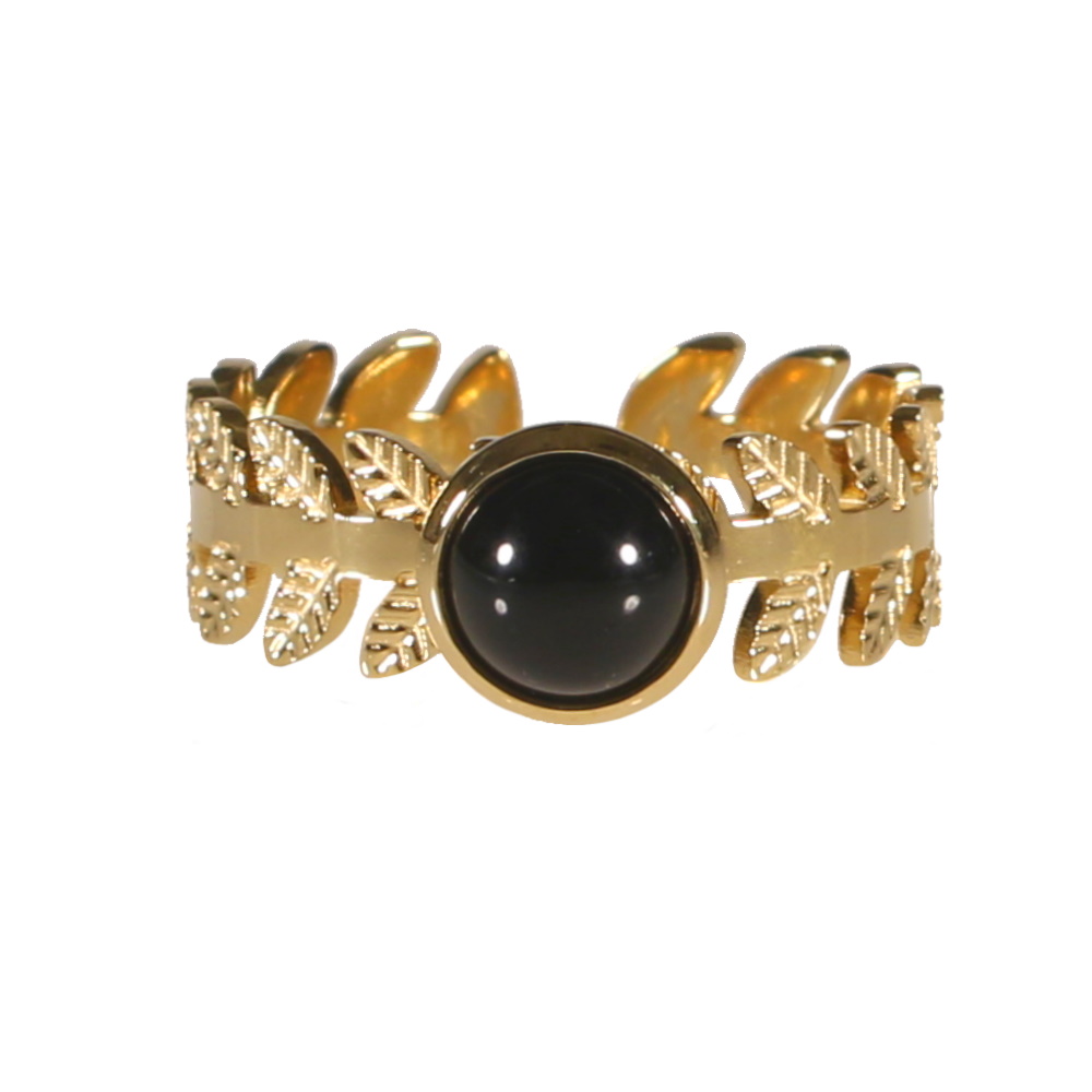 Bague au motif de branche de laurier en acier doré surmontée d'une véritable pierre d'agate noire sertie clos.
