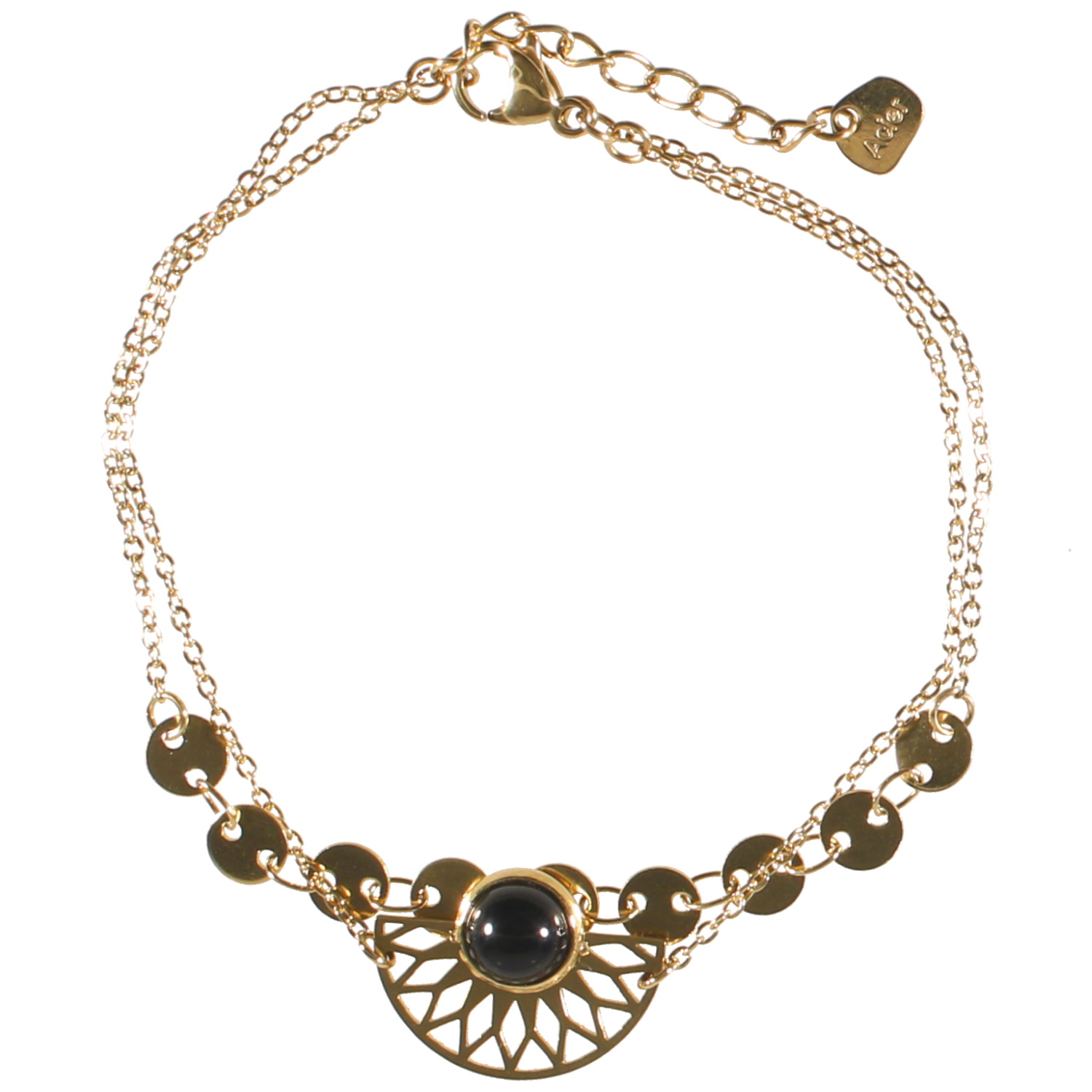 Bracelet double rangs composé d'une chaîne avec pastilles rondes en acier doré, ainsi qu'une chaîne avec un demi cercle au motifs ajourés en acier doré surmontée d'une véritable pierre d'agate noire.