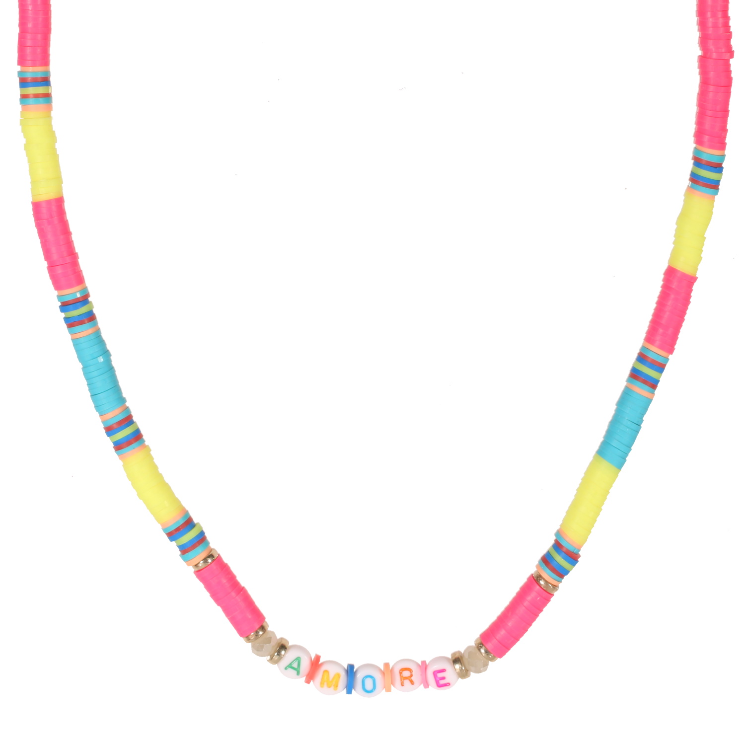 Collier fantaisie composé de perles cylindriques heishi en résine synthétique et caoutchouc multicolore, ainsi que des perles rondes avec des lettres pour faire le mot AMORE.