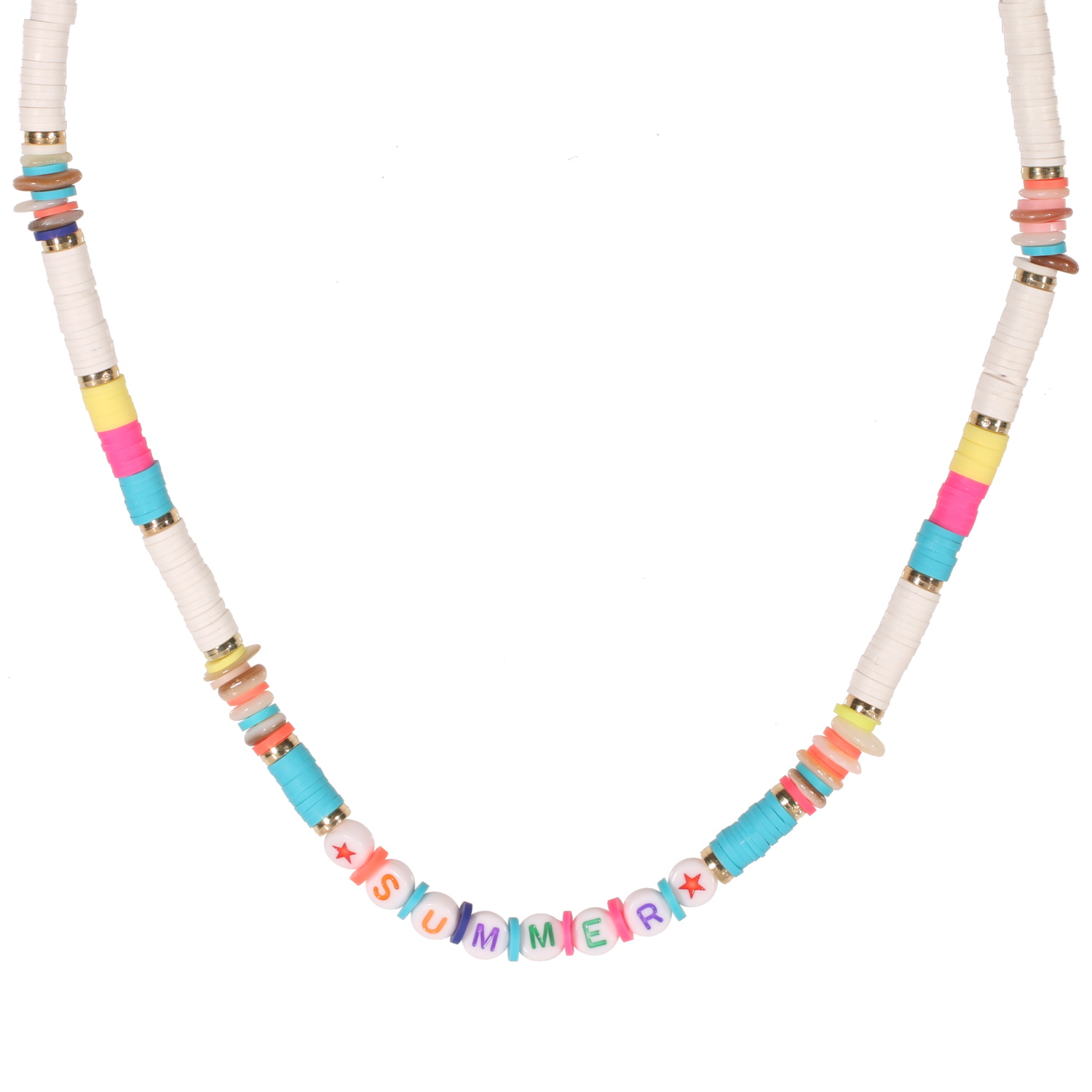 Collier fantaisie composé de perles cylindriques heishi en résine synthétique et caoutchouc multicolore, et perles de nacre, ainsi que des perles rondes avec des lettres pour faire le mot SUMMER et dessins d'étoiles.