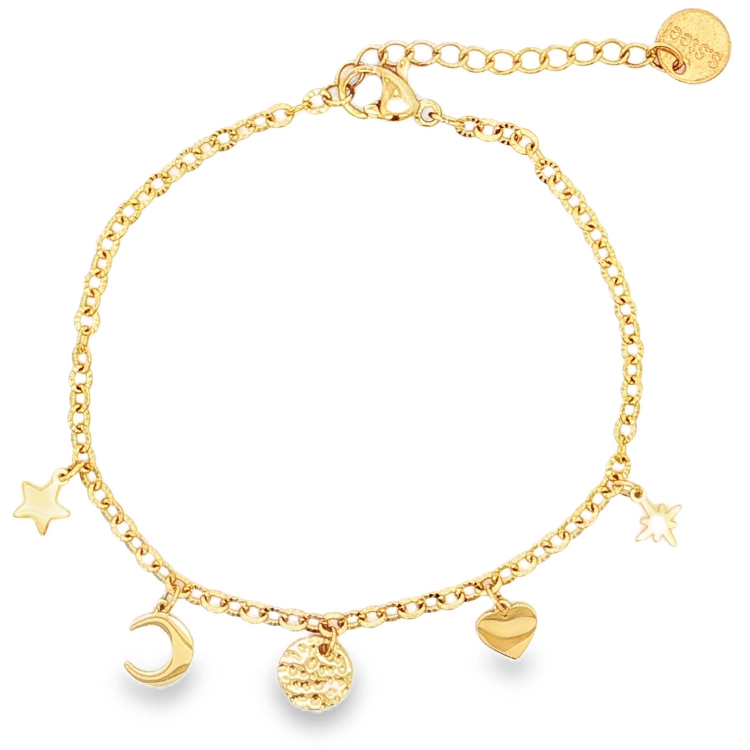 Description Ce charmant bracelet en acier doré apporte une touche d'éclat à votre collection de bijoux. Sa délicate chaîne dorée est agrémentée de breloques fantaisistes, créant un look à la fois tendance et raffiné. Parfait pour ajouter une note ludique à votre style quotidien. Fermoir mousqueton avec 3 cm de rallonge. Longueur 16+3 cm [Guide des tailles] Largeur 10 mm Matière(s) Acier . L'acier utilisé dans la bijouterie existe sous plusieurs qualités. Nous utilisons principalement la qualité 316L, qualité qui est utilisée en chirurgie. Cet acier est donc inoxydable et reste très résistant. Fermoir Mousqueton Couleur(s) dominante(s) Doré Public Adolescent , Adulte . Genre Femme , Fille . Saison Indémodable . Thème(s) Amour , Nature . Cliquez sur une matière, un thème, une couleur ou une collection pour voir tous les articles associés.