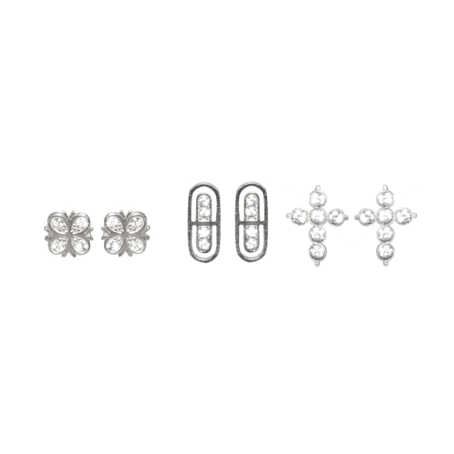 Lot de 3 paires de boucles d'oreilles puces en forme de croix et de trèfle en acier argenté serties de strass.