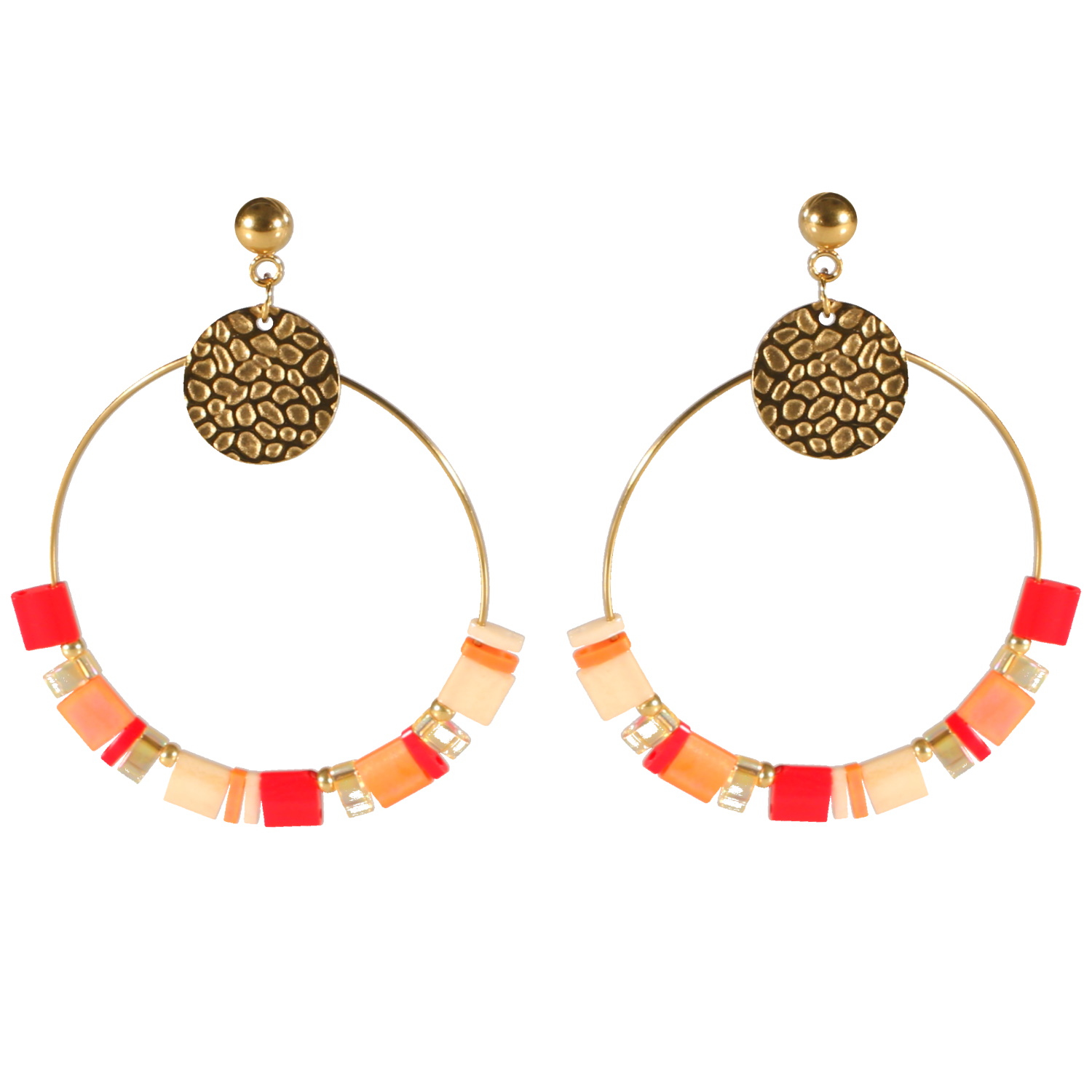 Description Boucles d'oreilles pendantes composées d'une pastille ronde martelée en acier doré et d'un cercle en acier doré avec des perles multicolores. Largeur 37 mm Hauteur 55 mm Matière(s) Acier , Résine . L'acier utilisé dans la bijouterie existe sous plusieurs qualités. Nous utilisons principalement la qualité 316L, qualité qui est utilisée en chirurgie. Cet acier est donc inoxydable et reste très résistant. Fermoir Tiges poussettes Couleur(s) dominante(s) Blanc , Doré , Rouge Public Adolescent , Adulte . Genre Femme , Fille . Saison Eté . Collection Hippie chic Cliquez sur une matière, un thème, une couleur ou une collection pour voir tous les articles associés.
