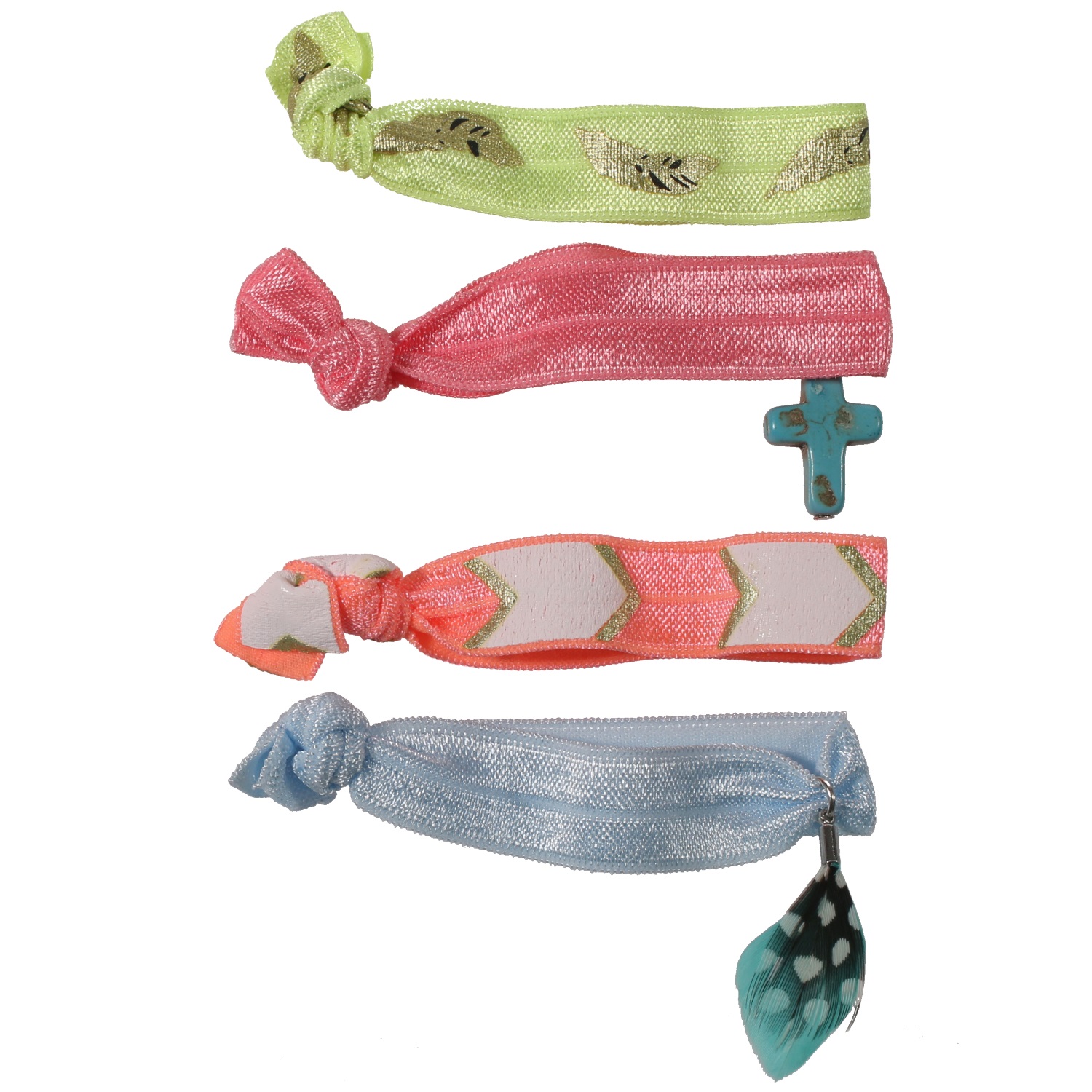 Lot de 4 bracelets élastiques en lycra, rocaille et plume.