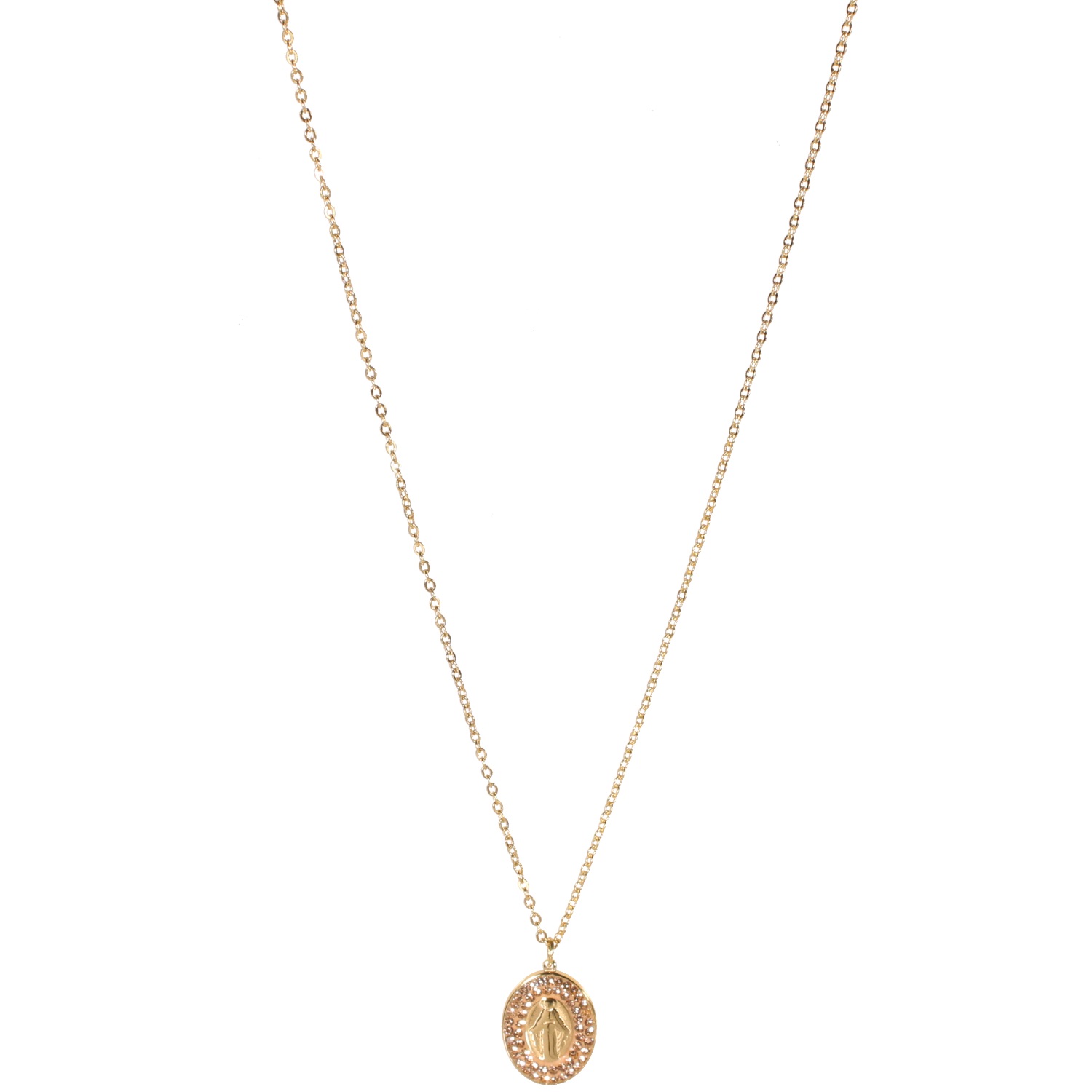 Collier avec pendentif Vierge en acier doré et strass en verre.