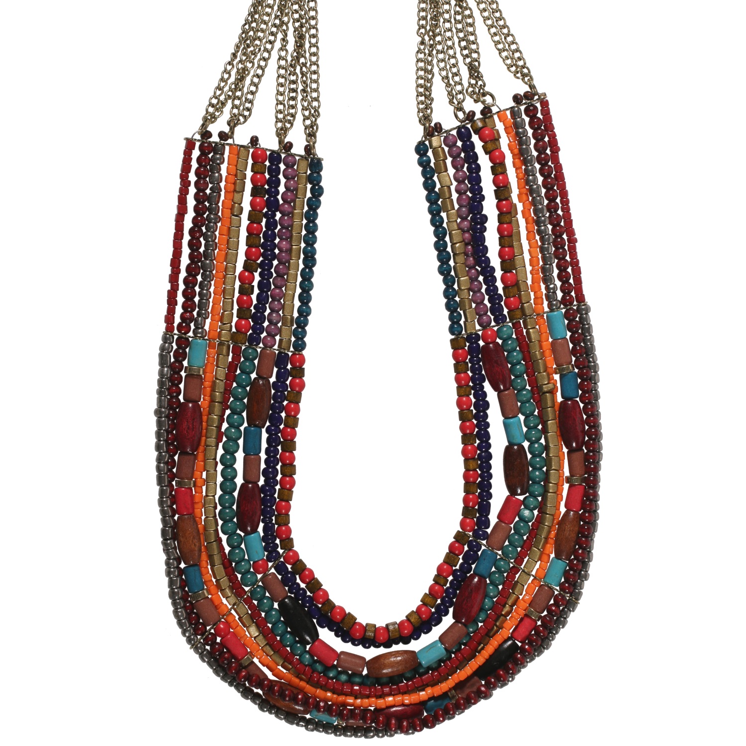Collier fantaisie en métal doré, métal canon de fusil, rocaille et bois.