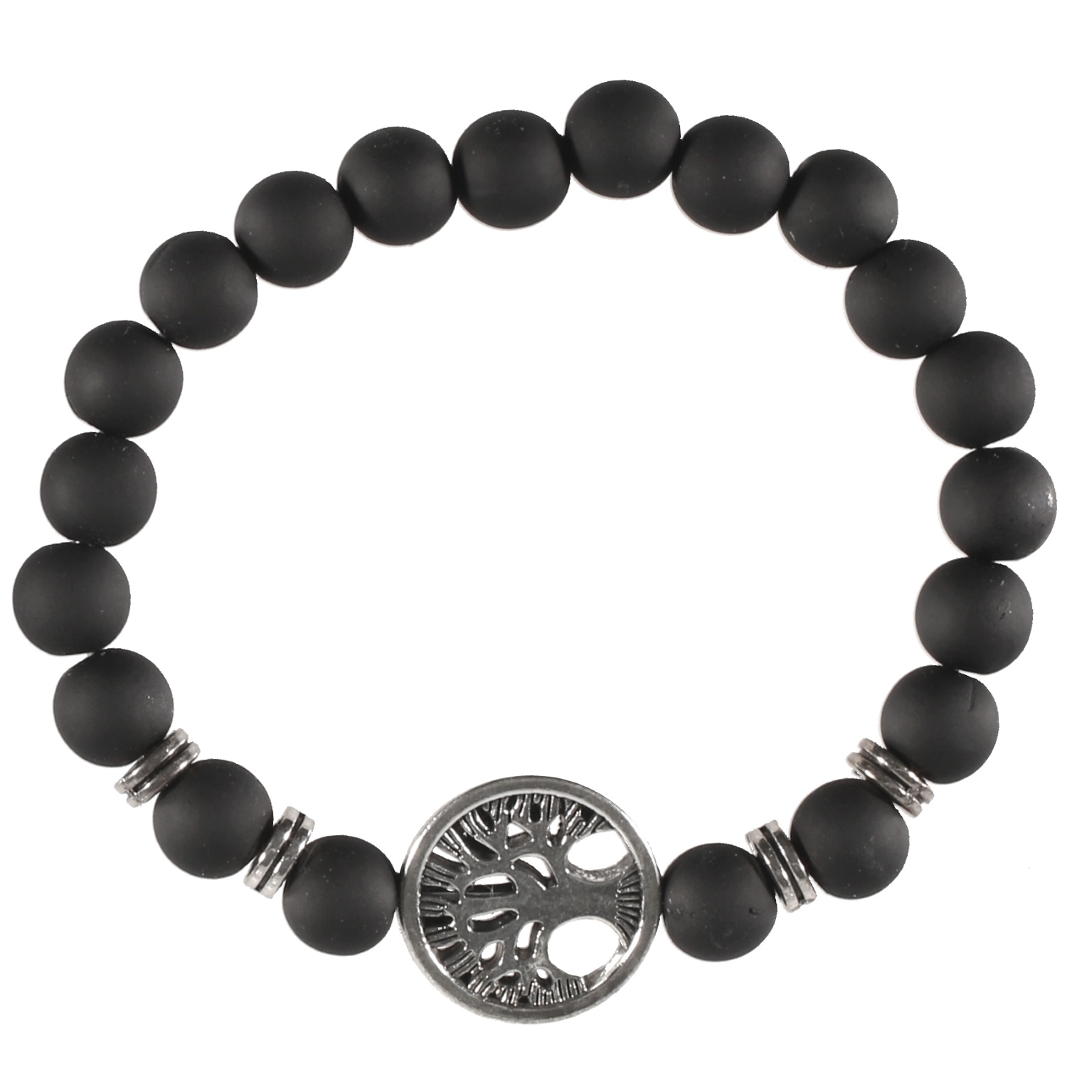Bracelet fantaisie élastique avec perles en plastique et arbre de vie en métal argenté.