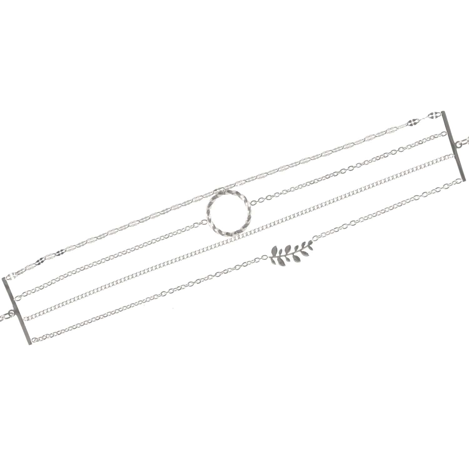 Description Bracelet quatre rangs avec feuilles de laurier et cercle en acier argenté. Cliquez sur une matière, un thème, une couleur ou une collection pour voir tous les articles associés.
