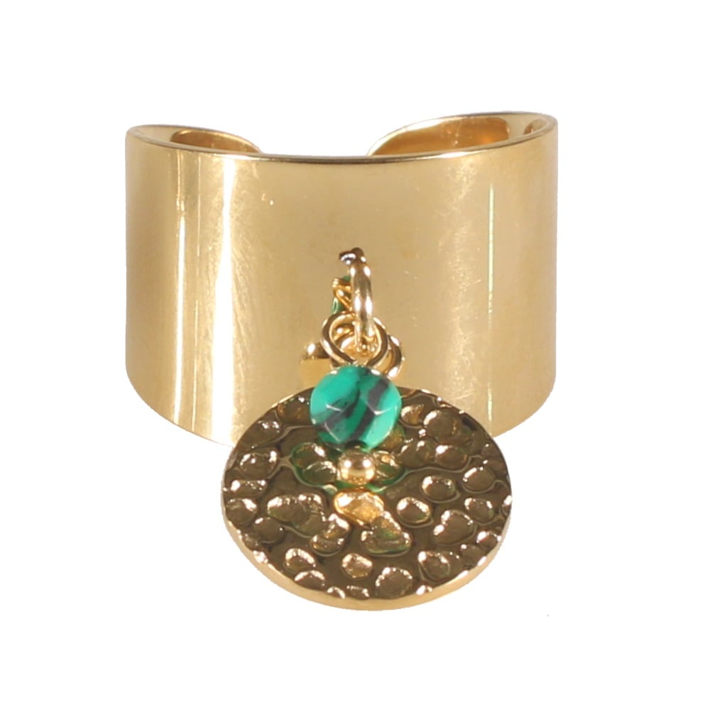 Description Bague avec pastille martelée en acier doré et perle d'imitation malachite. Taille ajustable. Largeur 13 mm Diamètre 12 mm [Guide des tailles] Matière(s) Acier , Rocaille . L'acier utilisé dans la bijouterie existe sous plusieurs qualités. Nous utilisons principalement la qualité 316L, qualité qui est utilisée en chirurgie. Cet acier est donc inoxydable et reste très résistant. À noter Taille ajustable Couleur(s) dominante(s) Doré , Vert Public Adolescent , Adulte . Genre Femme , Fille . Saison Indémodable . Collection Reflets Cliquez sur une matière, un thème, une couleur ou une collection pour voir tous les articles associés.