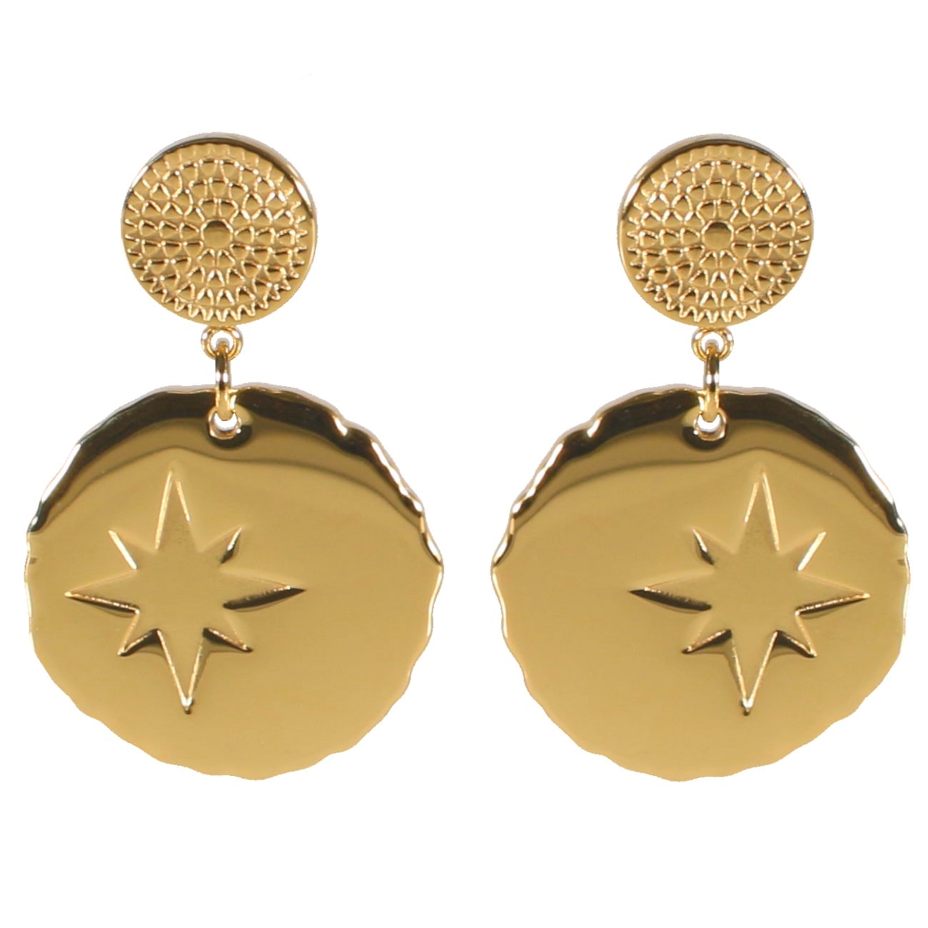 Description Boucles d'oreilles pendantes avec pastilles au motif étoile en acier doré. Largeur 20 mm Hauteur 32 mm Matière(s) Acier . L'acier utilisé dans la bijouterie existe sous plusieurs qualités. Nous utilisons principalement la qualité 316L, qualité qui est utilisée en chirurgie. Cet acier est donc inoxydable et reste très résistant. Fermoir Tiges poussettes Couleur(s) dominante(s) Doré Public Adolescent , Adulte . Genre Femme , Fille . Saison Indémodable . Thème(s) Nature . Collection Astre sublime Cliquez sur une matière, un thème, une couleur ou une collection pour voir tous les articles associés.