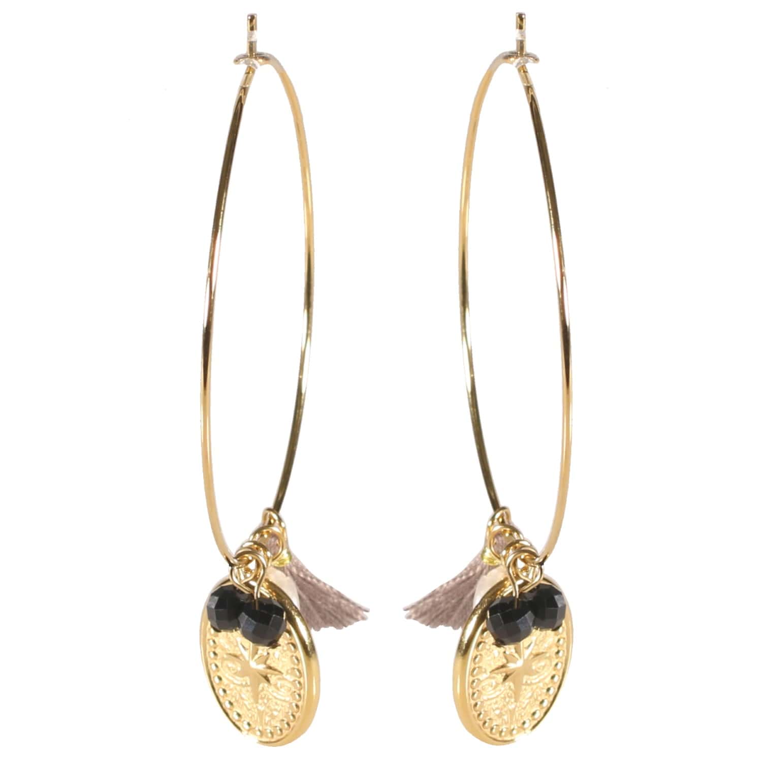 Boucles d'oreilles créoles en acier doré avec pendants médaillons avec motif d'étoile en acier doré, perles de couleur noire, perles de nacre et pompons en textile.