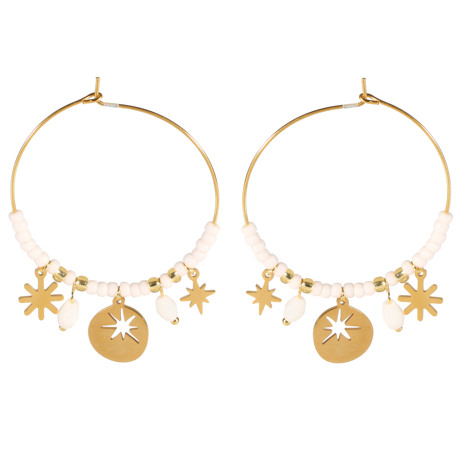 Boucles d'oreilles créoles avec pendants au motifs d'étoiles en acier doré et perles de couleur.