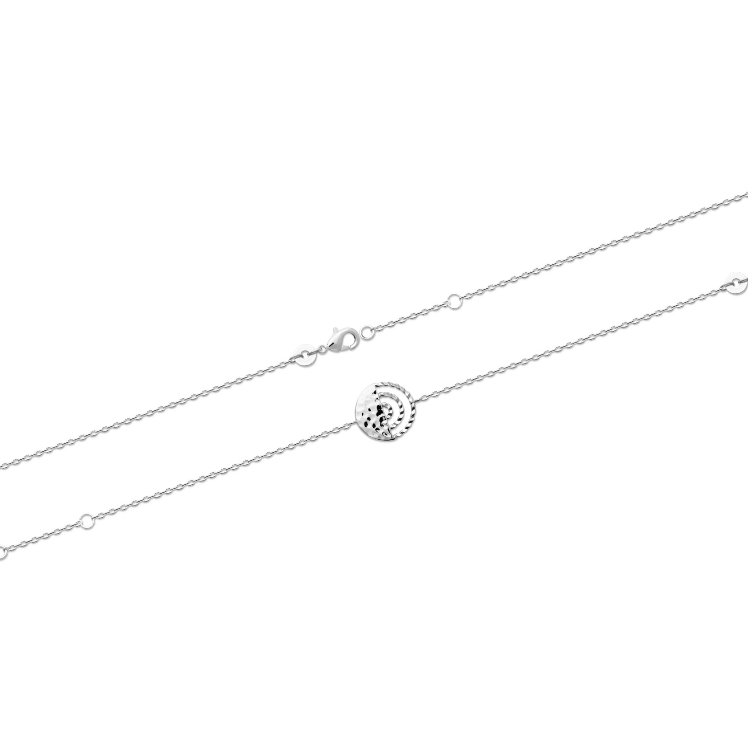 Description Bracelet composé d'une chaîne et d'une pastille ronde à moitié martelée et trois demi-cercles en argent 925/000 rhodié. Fermoir mousqueton avec anneaux de rappel à 16 et 18 cm. Longueur 16/18 cm [Guide des tailles] Largeur 13 mm Matière(s) Argent 925 rhodié . Afin de protéger votre bijou de l'oxydation naturelle de l'argent, il est recouvert d'une couche de rhodium (un métal rare et précieux) qui garantira sa brillance dans le temps et préviendra les risques d'allergie. Notez cependant, que le bijou est alors d'une teinte plus grisée et moins brillante que l'argent non rhodié. Poids d'argent 1,74 gramme(s) Fermoir Mousqueton Couleur(s) dominante(s) Argenté Public Adolescent , Adulte . Genre Femme , Fille . Saison Indémodable . Cliquez sur une matière, un thème, une couleur ou une collection pour voir tous les articles associés.