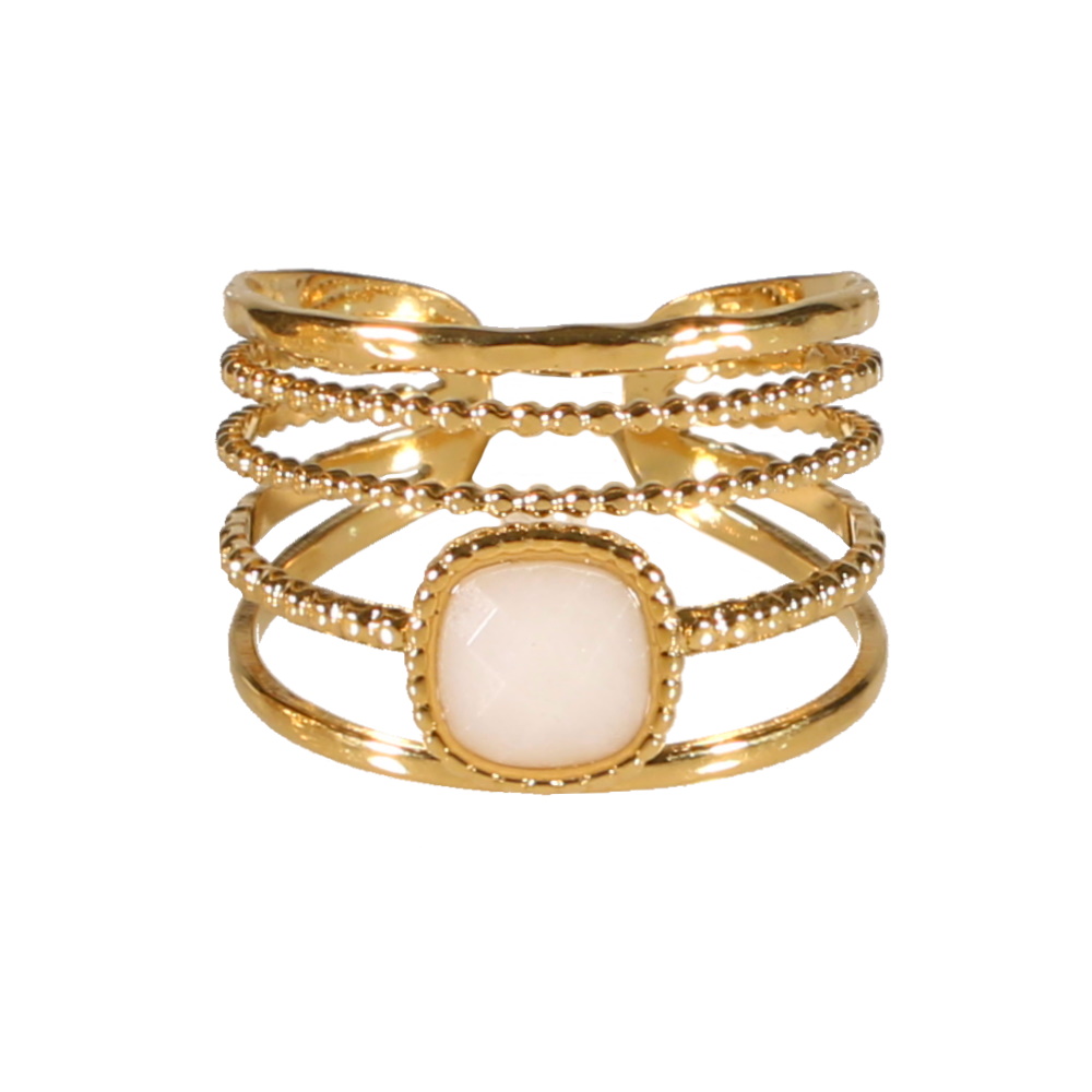 Bague cinq rangs en acier doré surmontée d'une véritable pierre de jade blanc sertie clos.
