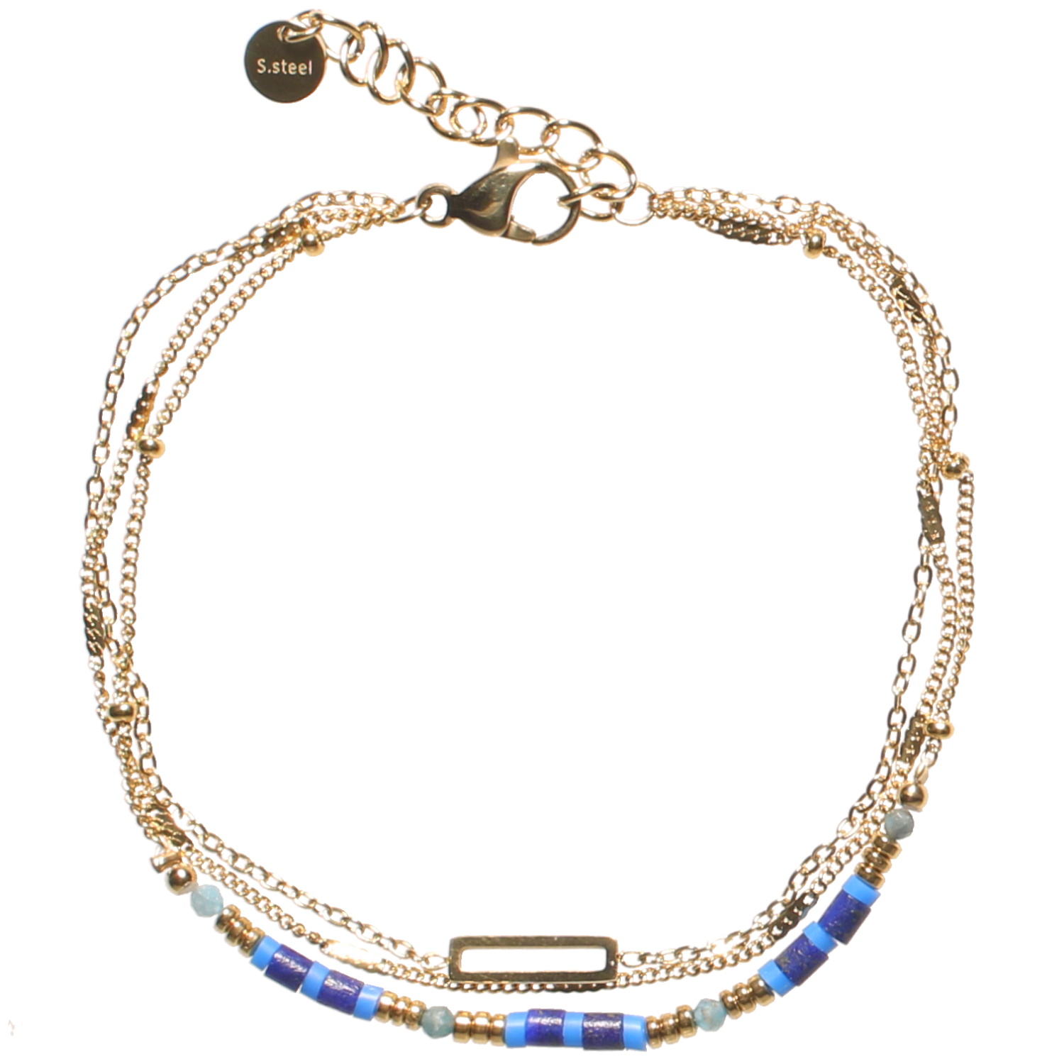 Bracelet triple rangs composé d'une chaîne en acier doré, d'une chaîne avec un rectangle en acier doré, ainsi qu'une chaîne avec perles en acier doré, de perles de couleur bleue et de perles cylindriques en caoutchouc de couleur bleue.