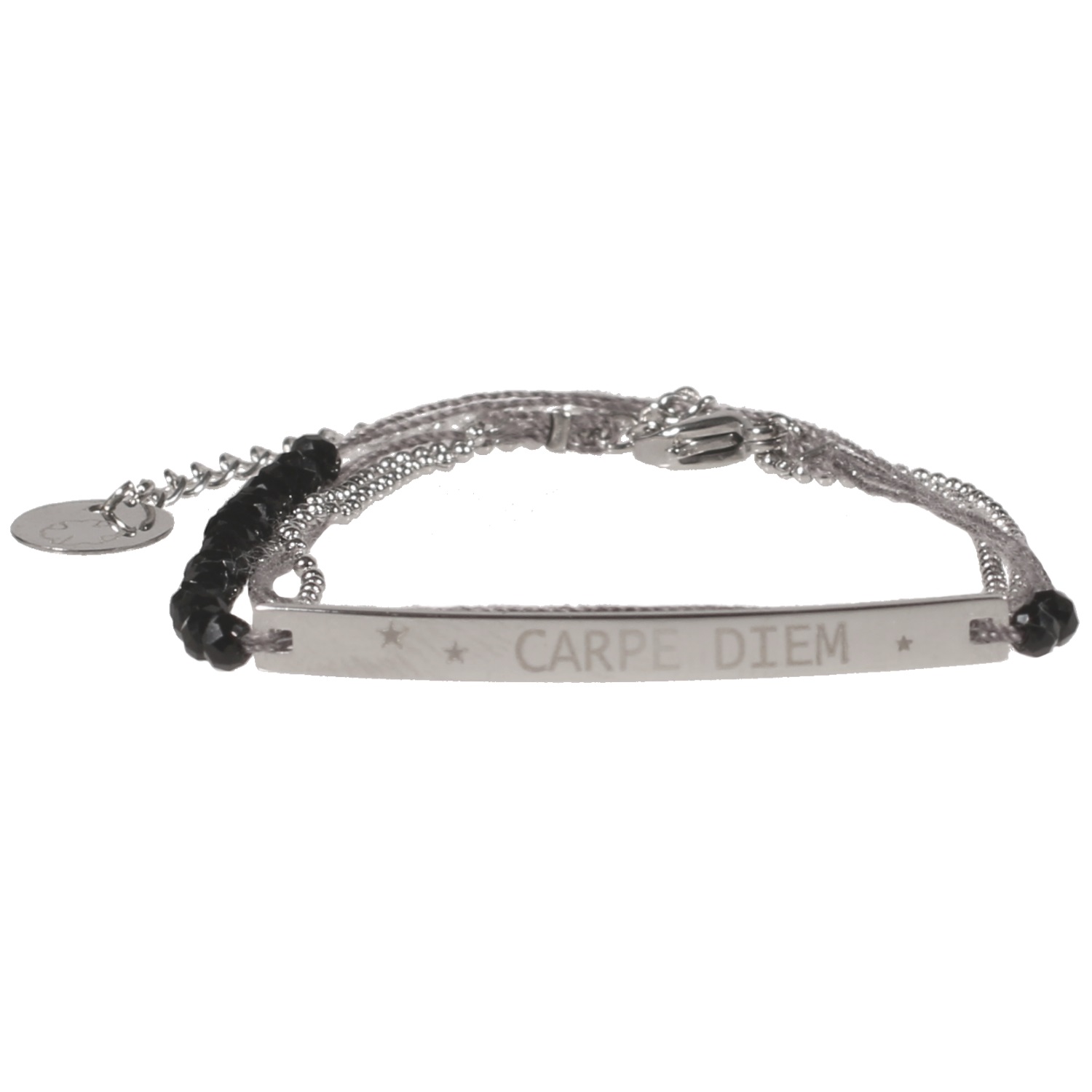 Bracelet "Carpe Diem" en acier, textile et pierres synthétiques.