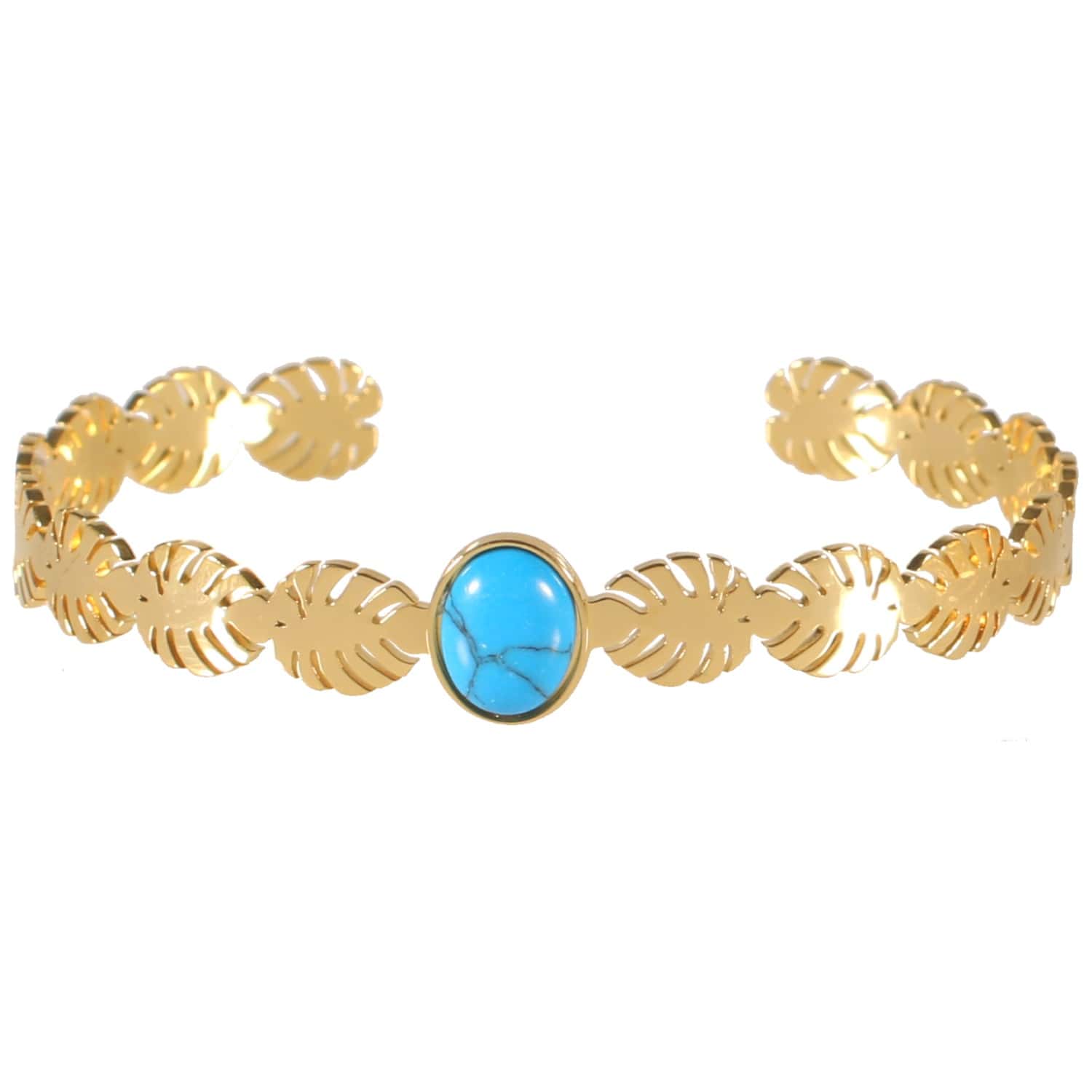 Description Bracelet jonc ouvert avec feuilles philodendron en acier doré et pierre ovale d'imitation turquoise. Cliquez sur une matière, un thème, une couleur ou une collection pour voir tous les articles associés.