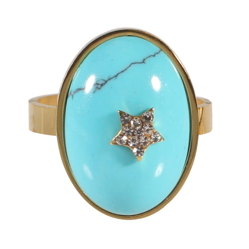 Bague en acier doré, pierre d'imitation turquoise et étoile avec strass.