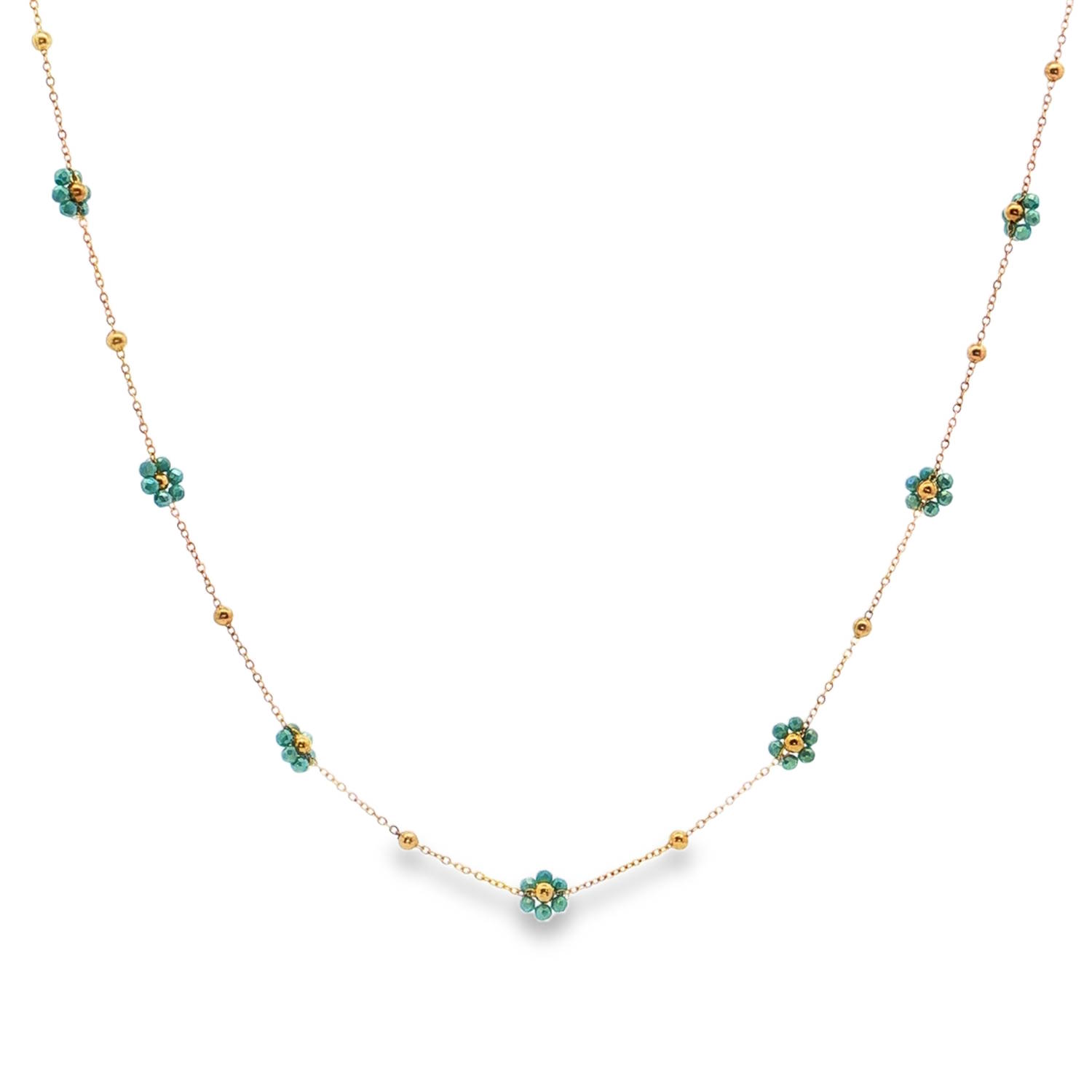 Entre chaque fleur, des perles dorées lisses sont disposées le long de la chaîne pour équilibrer la composition et accentuer l'éclat de l'ensemble.