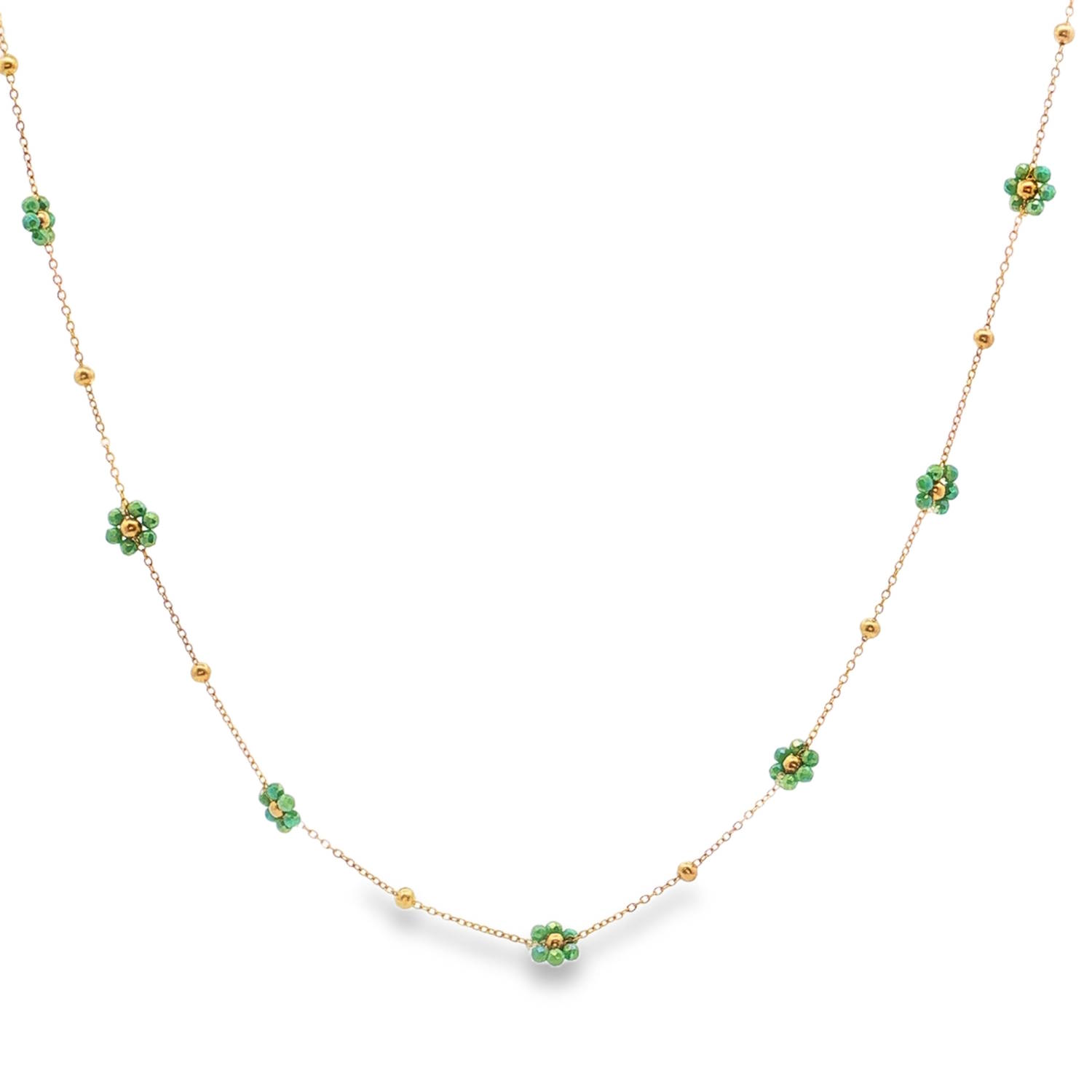 Le bijou est rythmé par de petites fleurs de type marguerites. Chaque fleur est composée de pétales en perles facettées vert clair, entourant un cœur doré scintillant.