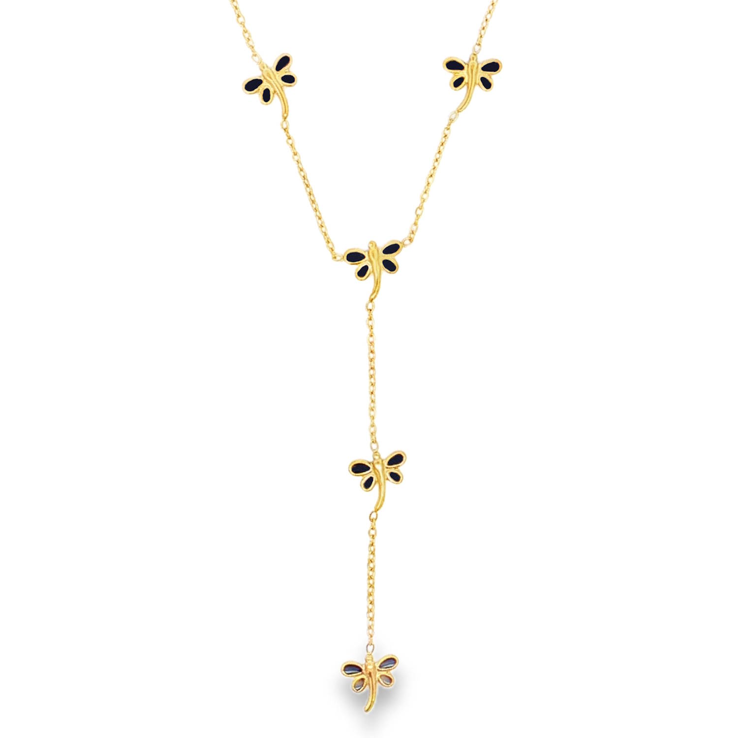 Sublime collier en acier doré, délicatement orné de motifs libellule pavés d'émail noir.